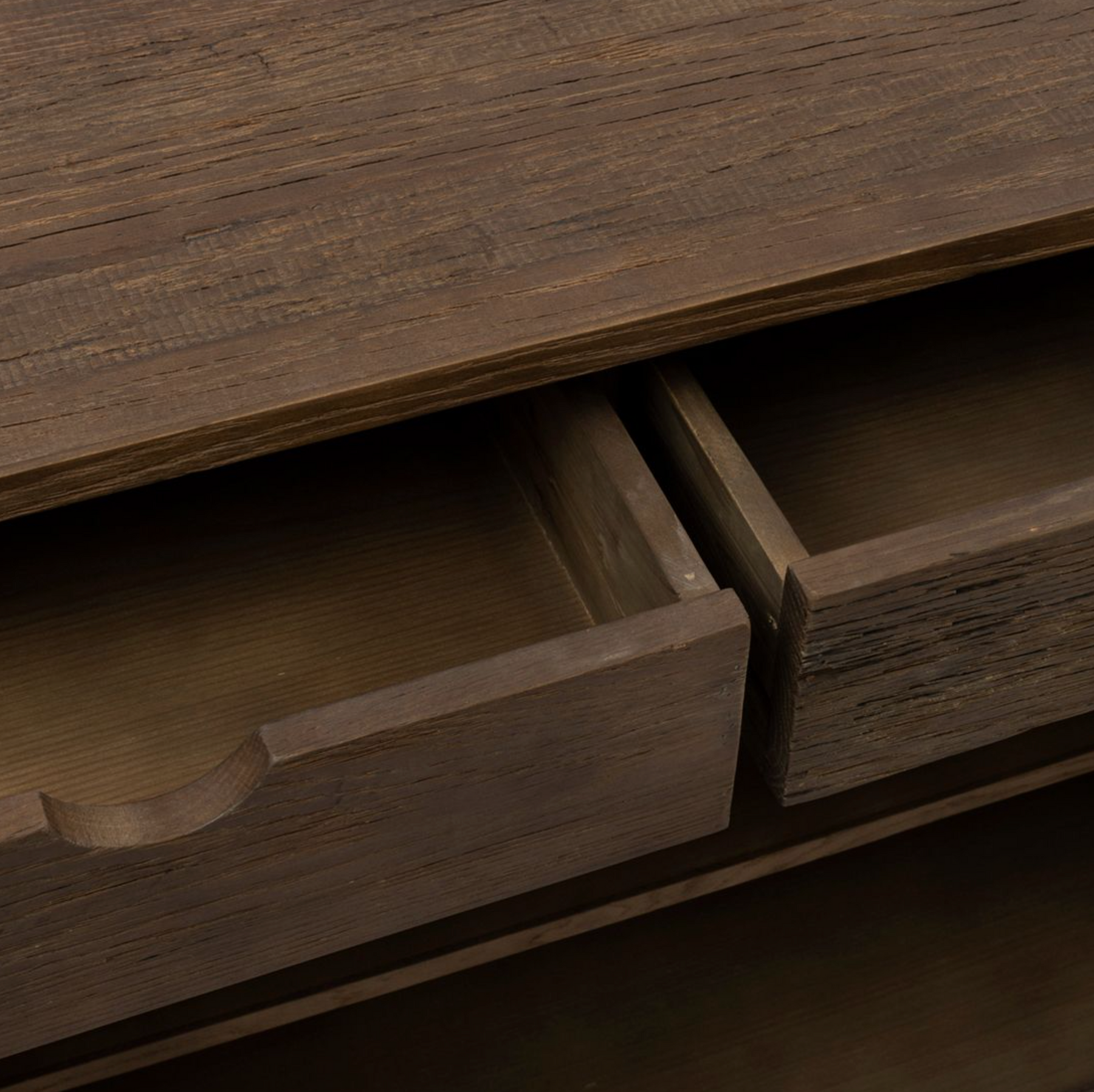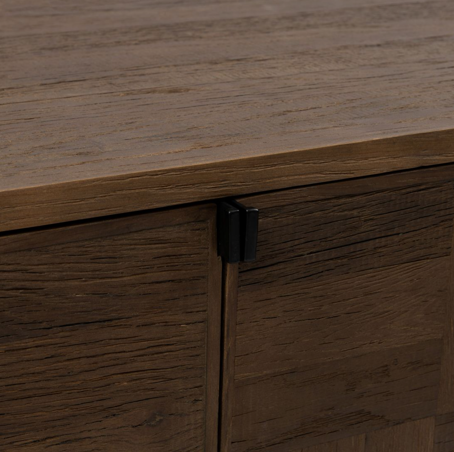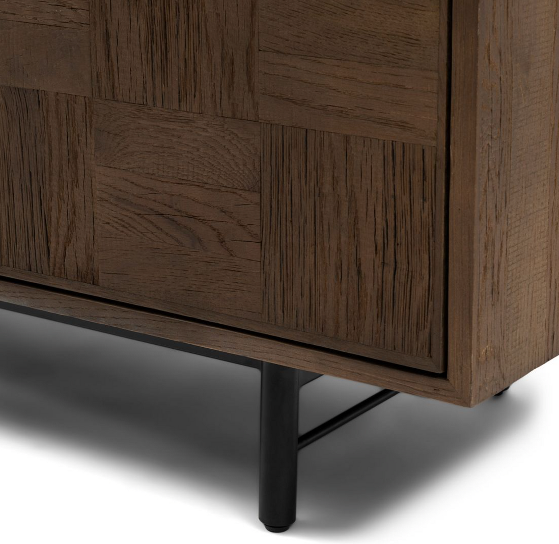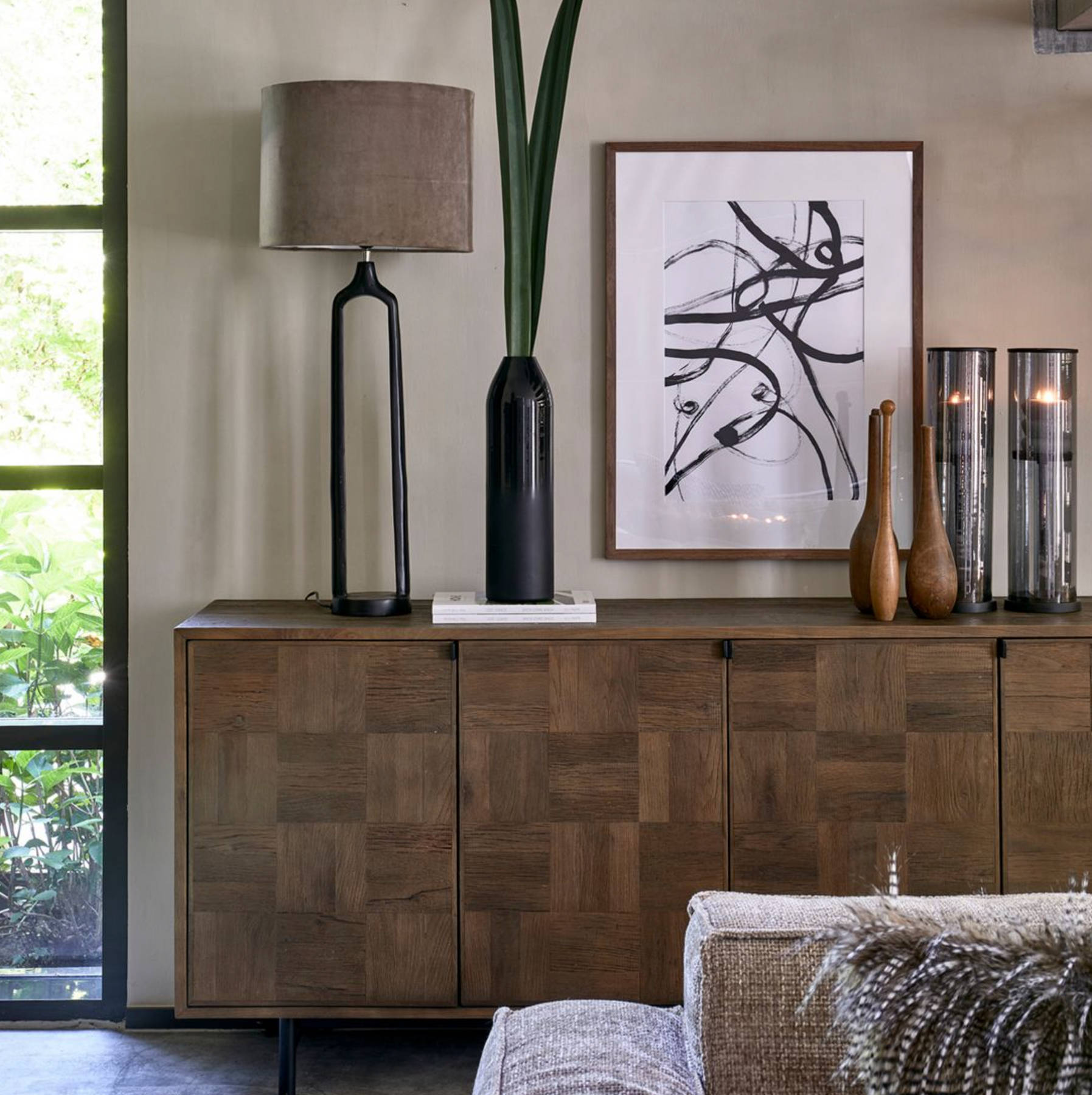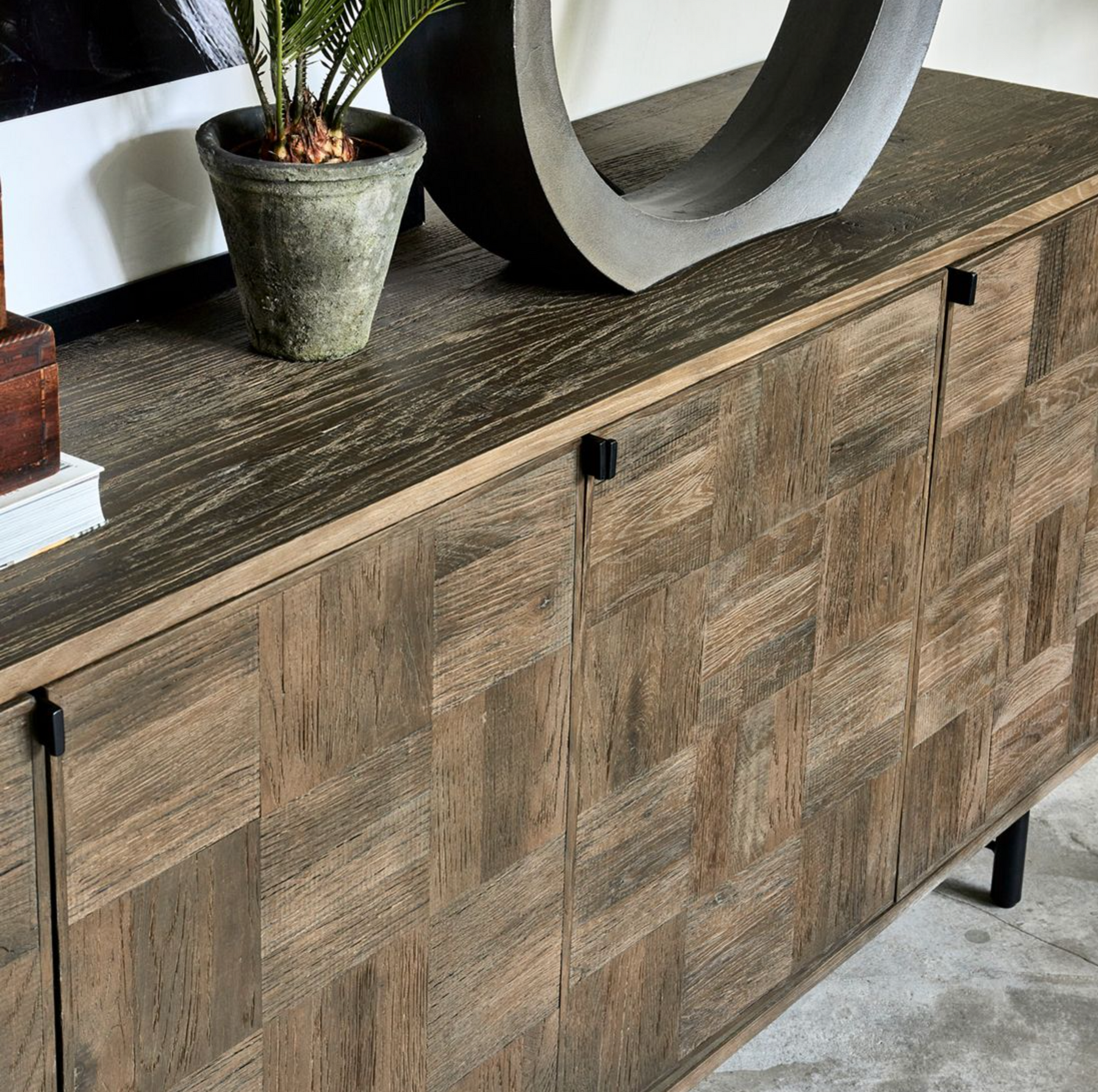 قوية ولكنها أنيقة، هذه هي خزانة Mac Arthur الجانبية. تقف هذه الخزانة الجانبية من Riviera Maison على أقدام معدنية داكنة تضفي عليها مظهرًا أنيقًا. قطع الخزانة نفسها مصنوعة من خشب البلوط المستصلح الجميل، الموضوعة في مربعات متناوبة. يوجد أيضًا درج خلف اثنين من الأبواب الأربعة ذات الإغلاق الناعم.