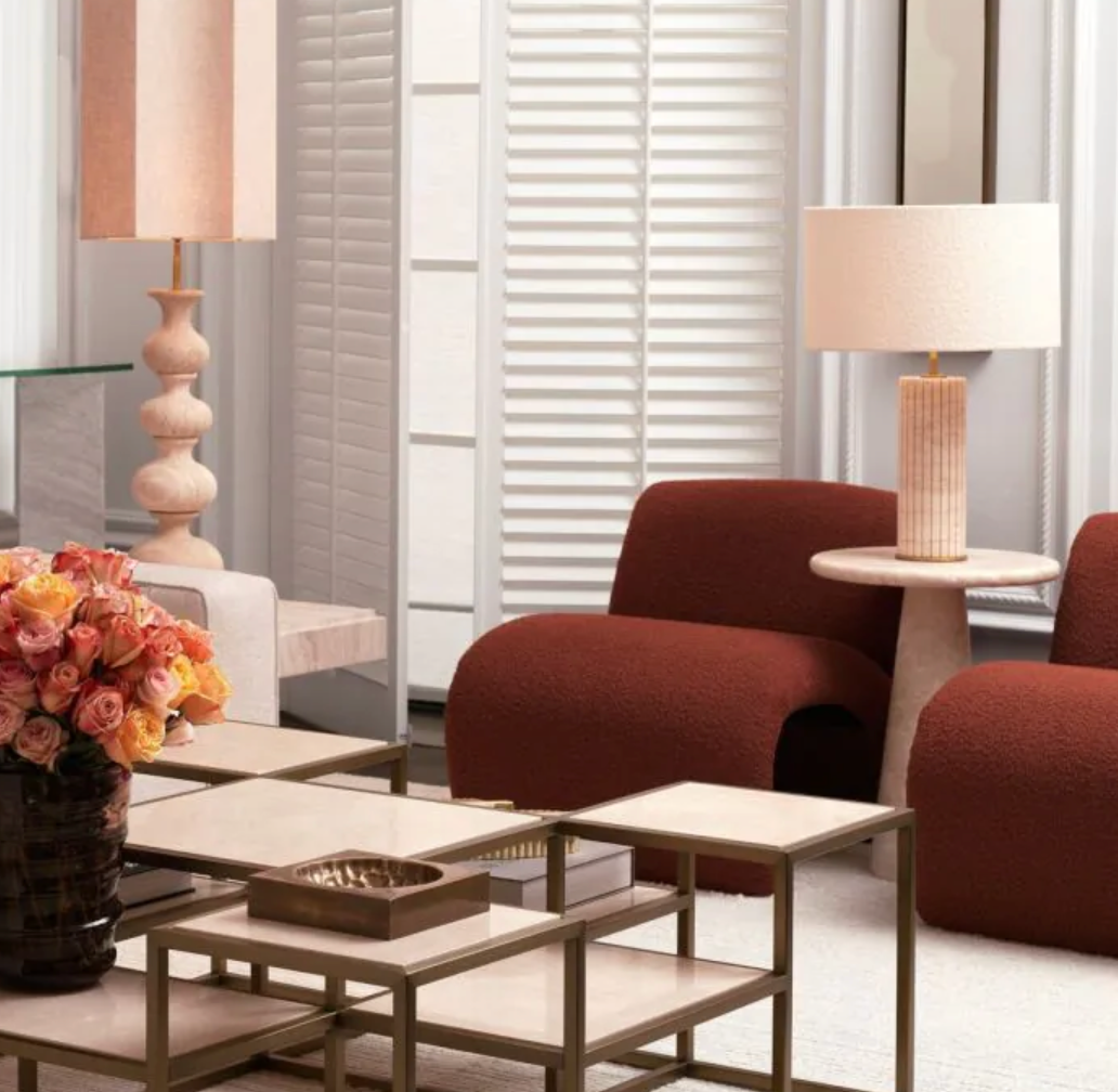 - Design und Stil: Runde Travertinbasis mit einzigartigen natürlichen Variationen, Luxuriöser Bouclé-Schirm, Elegantes Design mit natürlichem Charme
