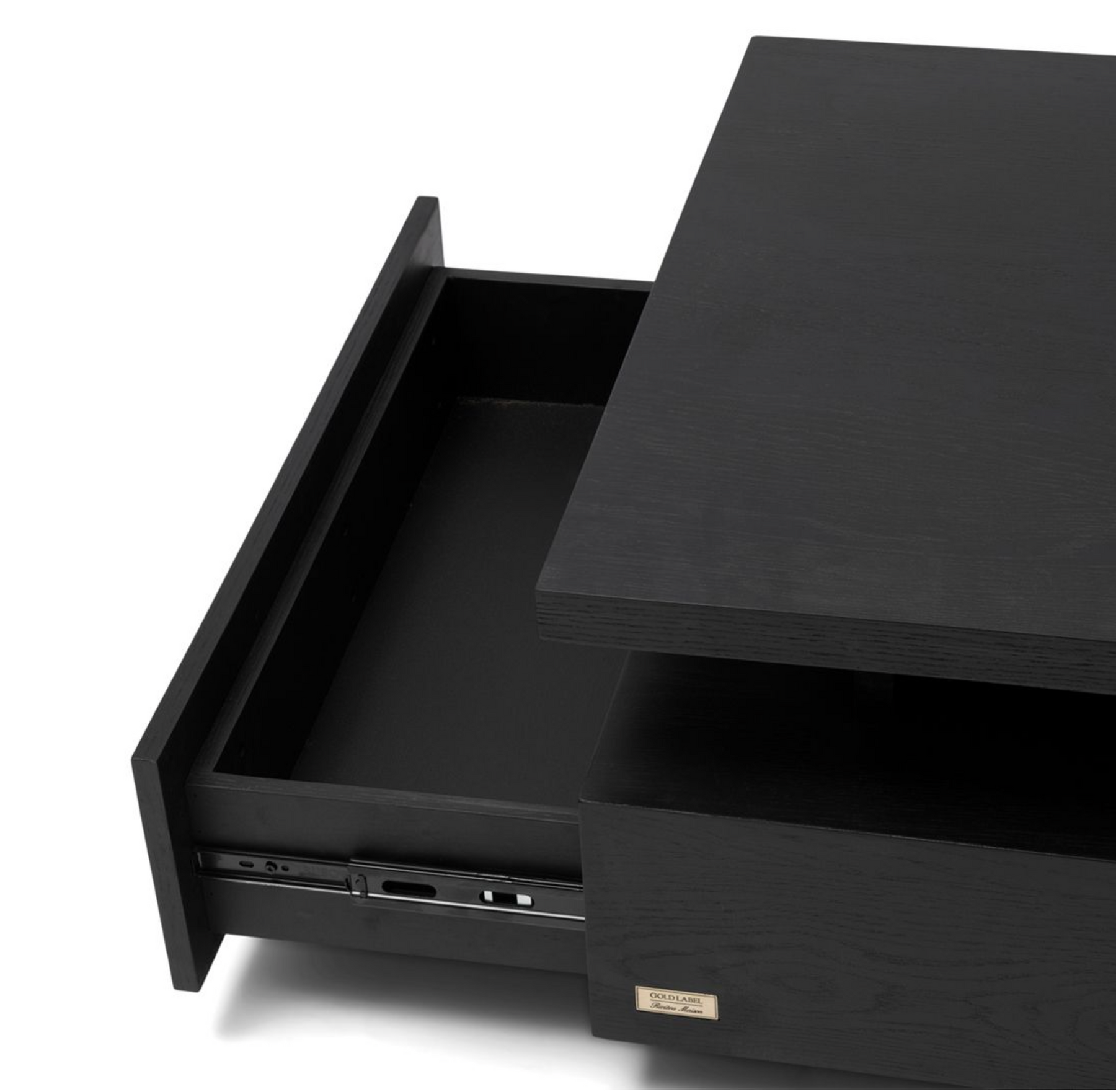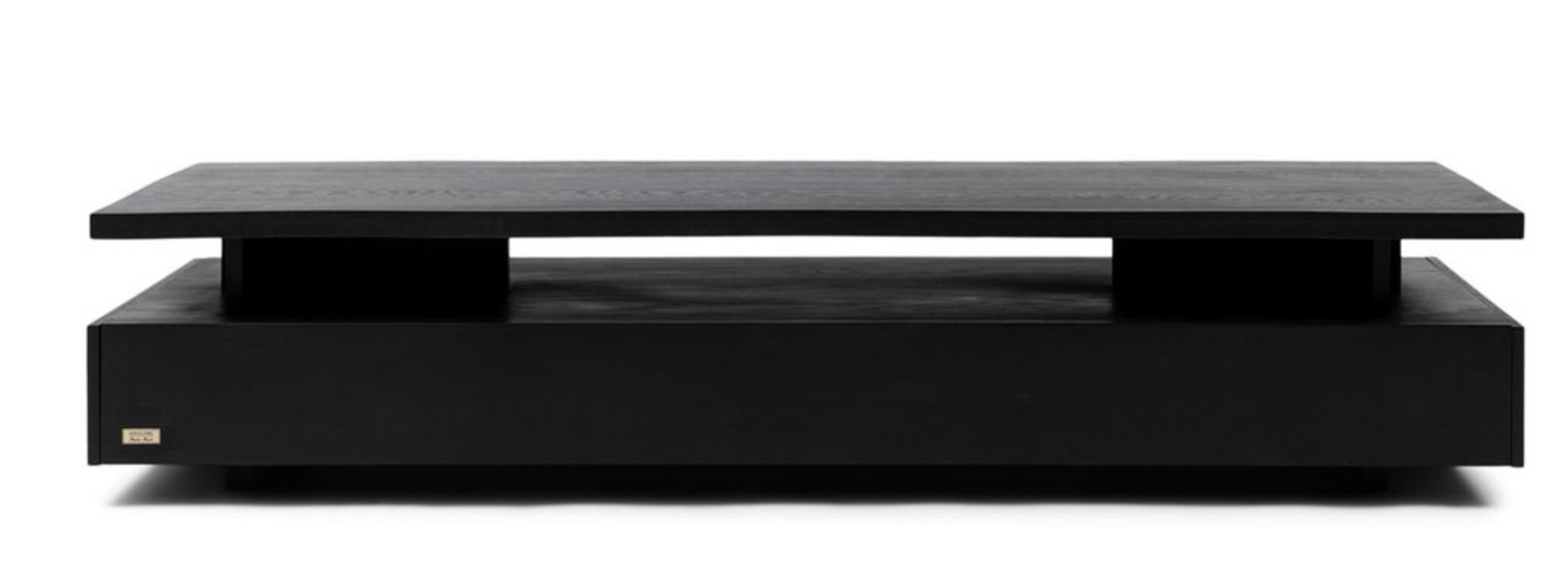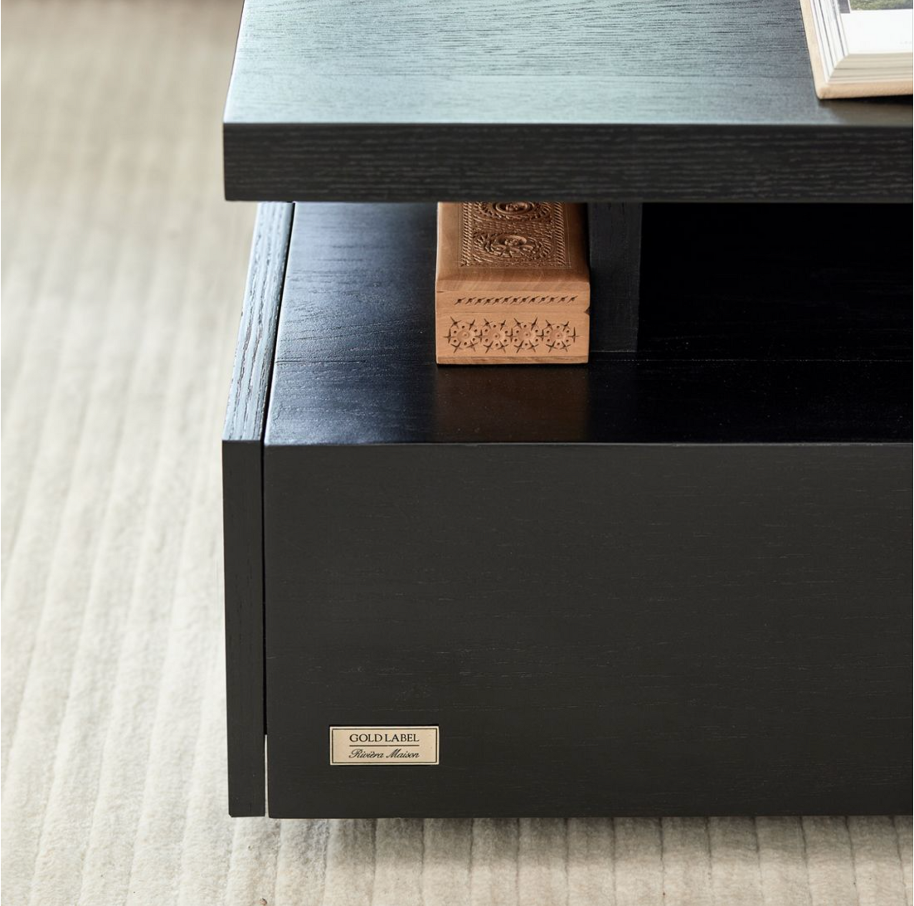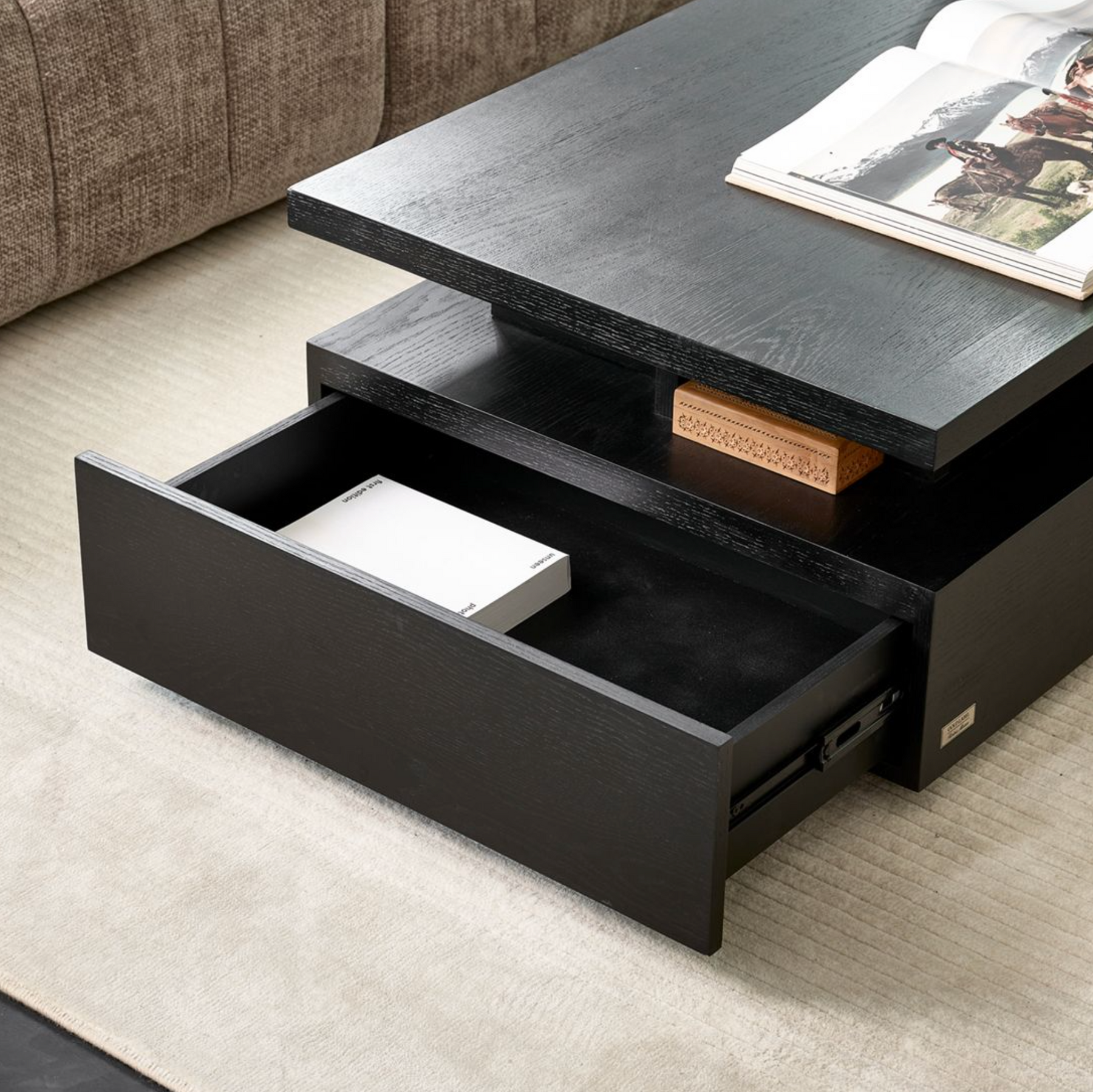 Der 5th Avenue Couchtisch von Riviera Maison ist aus robustem, dunklem Eichenholz gefertigt. Das obere Blatt scheint zu schweben, da die Befestigung an zwei Punkten zwischen den beiden Teilen angebracht ist. Möchten Sie etwas außer Sichtweite aufbewahren? Dann nutzen Sie eine der beiden geräumigen Schubladen an der Stirnseite.
