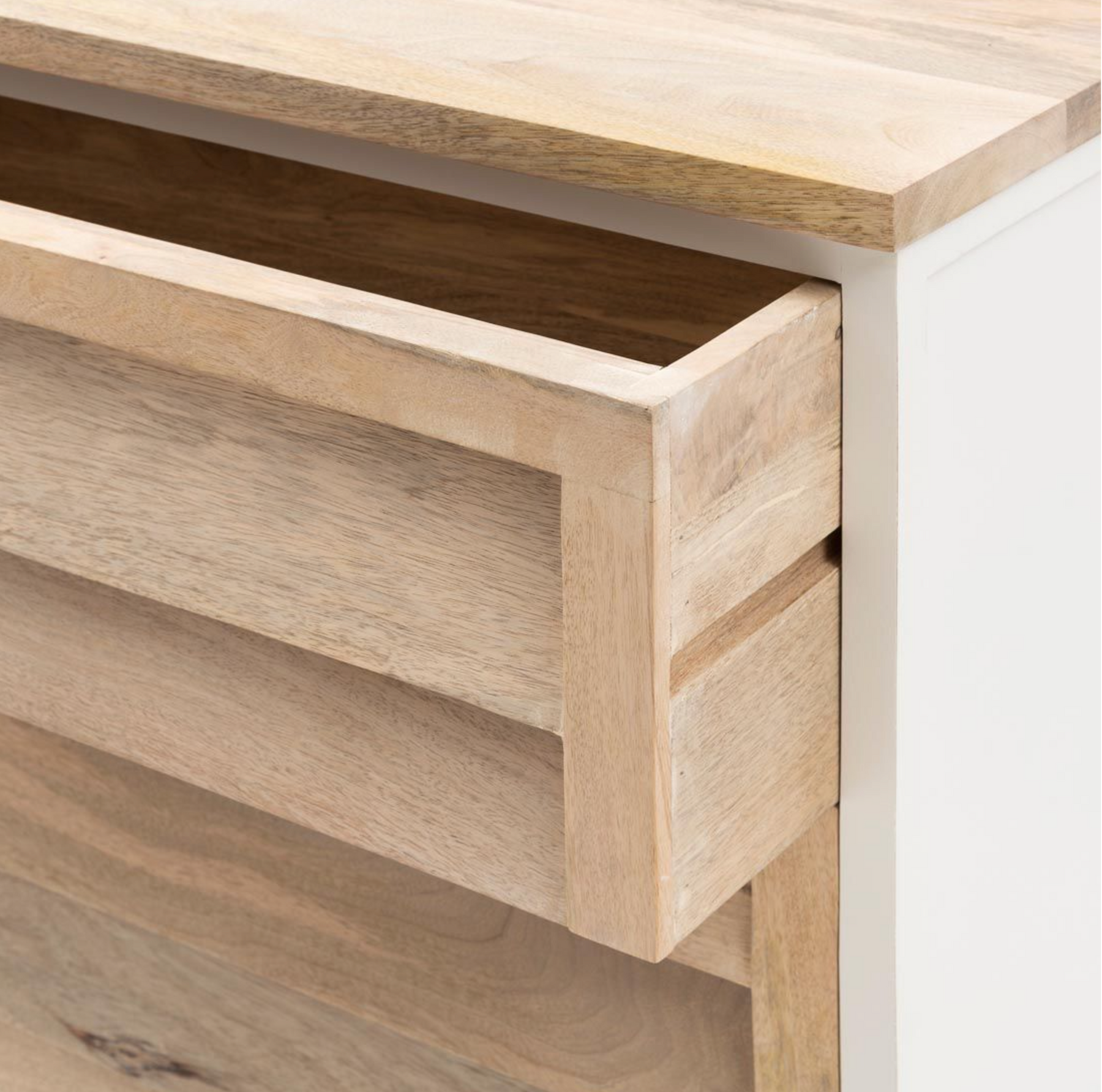 Wussten Sie, dass Mangoholz nicht nur für Accessoires verwendet werden kann, sondern dass sich daraus auch sehr attraktive Möbel fertigen lassen? So wie beispielsweise diese große Kommode Pacifica von Riviera Maison, die komplett aus Mangoholz gefertigt ist. Der Rahmen des Schranks ist weiß lackiert, während die Schubladen und die Platte naturfarben sind und eine markante Klappladenstruktur aufweisen. In unterschiedlichen Ausführungen erhältlich.