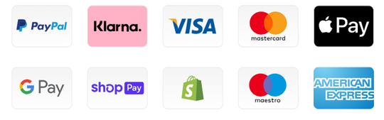 Kreditkort (Visa & MasterCard), PayPal, Klarna, Apple-Pay, Google-Pay, Shopify Pay.