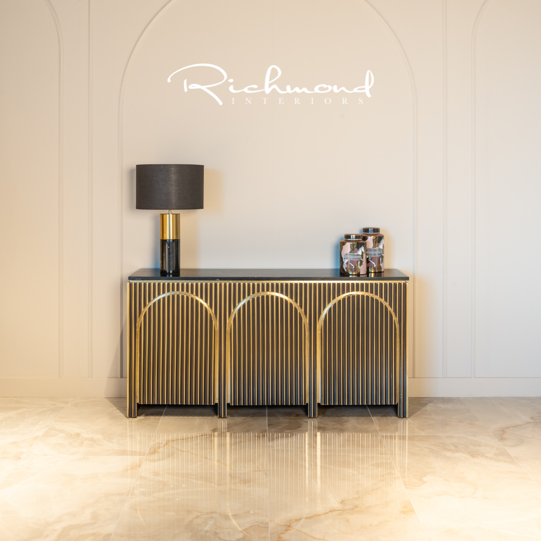 De Les buer samling af Richmond Interiors Kombinerer moderne design med luksuriøs æstetik. Hvert møbelmøbler er kendetegnet ved ædle materialer som messing, marmor og MDF, der skinner i en børstet guldoverflade. De klare linjer og elegante buer sikrer en stilfuld accent i stuer og soveværelser, hvorved den harmoniske kombination af materialer af høj kvalitet og moderne design danner hjertet i denne samling.
