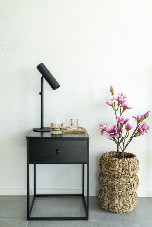 - Design og stil: Sidebord med en skuffe, sort ramme