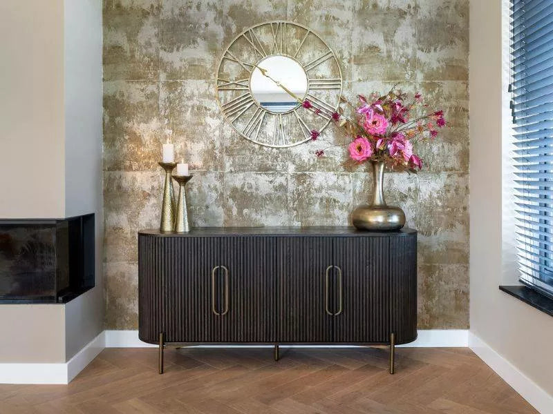 The Sideboard Luxor impresses with a dark brown wooden surface with rounded corners, which ensures a soft and modern look. The vertical grooves give the front a subtle structure. A special highlight are the four doors that are provided with large, oval, gold -colored handles - perfect to give the room a luxurious touch. The narrow, gold -colored feet complement the elegant design and ensure a floating look.
