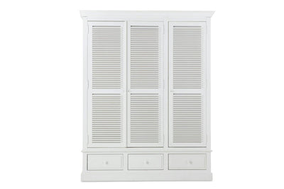 This white cabinet with three doors and slat structure as well as three drawers in the lower area offers a lot of storage space in a simple, classic style. It fits perfectly in larger bedrooms or dressing room.