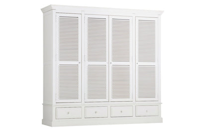 This large, white cabinet with four slat doors and four drawers in the lower area embodies the classic country house style. It offers a lot of storage space and fits perfectly in spacious bedrooms or corridors.