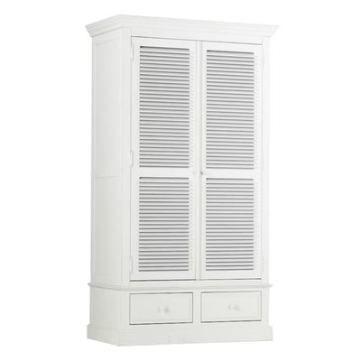 The narrow, white cabinet with two lamel doors and two drawers in the lower area is perfect for smaller bedrooms or corridors. The classic look with subtle details fits almost every room concept.