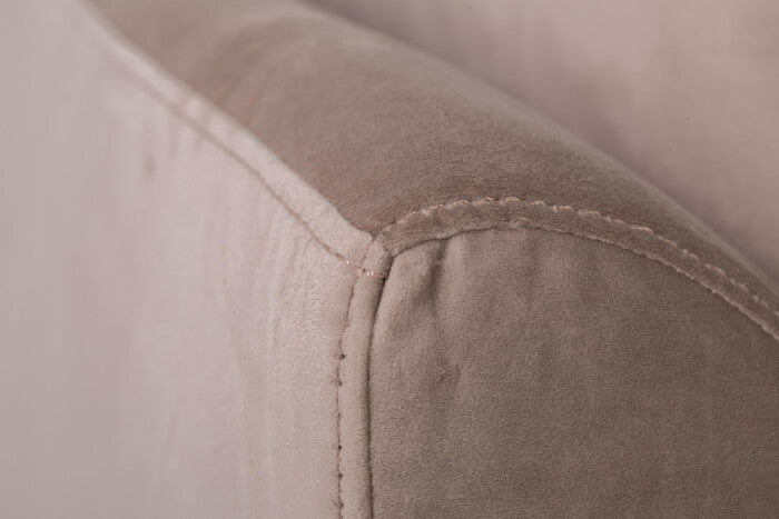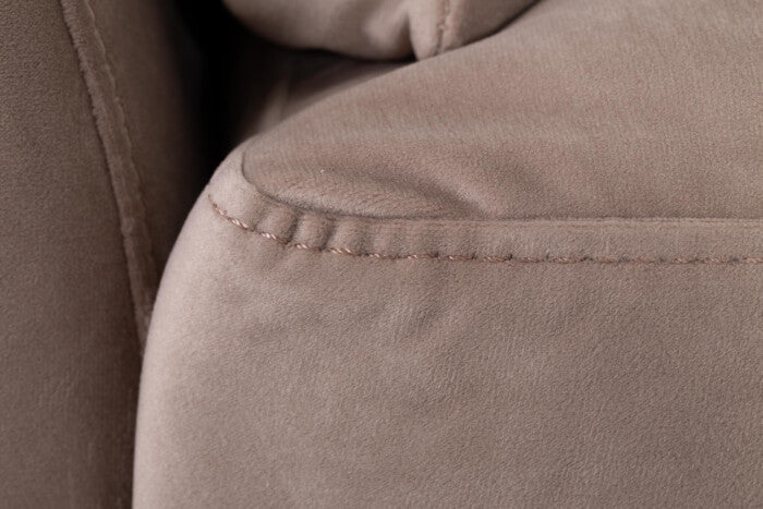 La combinación de colores suaves y cálidos del sofá resulta especialmente elegante en combinación con tonos como crema, marfil, arena o capuchino. Los muebles de madera oscura, los accesorios en negro o los detalles en oro, latón y azul medianoche crean contrastes elegantes. Los tonos verdes como el salvia o el oliva también encajan a la perfección.