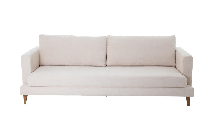 esto Flamant sofá MEMPHIS armoniza con estilo la ligereza moderna y las formas claras. Las líneas reducidas, combinadas con la delicada base elevada de roble, le dan a este sofá una apariencia flotante. La funda de tela ligera con estructura fina tiene un aspecto elegante y acogedor, ideal para interiores modernos y minimalistas. Con una longitud de 240 cm y una profundidad de asiento de 63 cm, el sofá MEMPHIS ofrece un gran confort, mientras que los dos cojines del respaldo garantizan un apoyo agradable. Los delgados reposabrazos y su delicada forma lo convierten en la pieza de diseño perfecta para habitaciones con estilo.