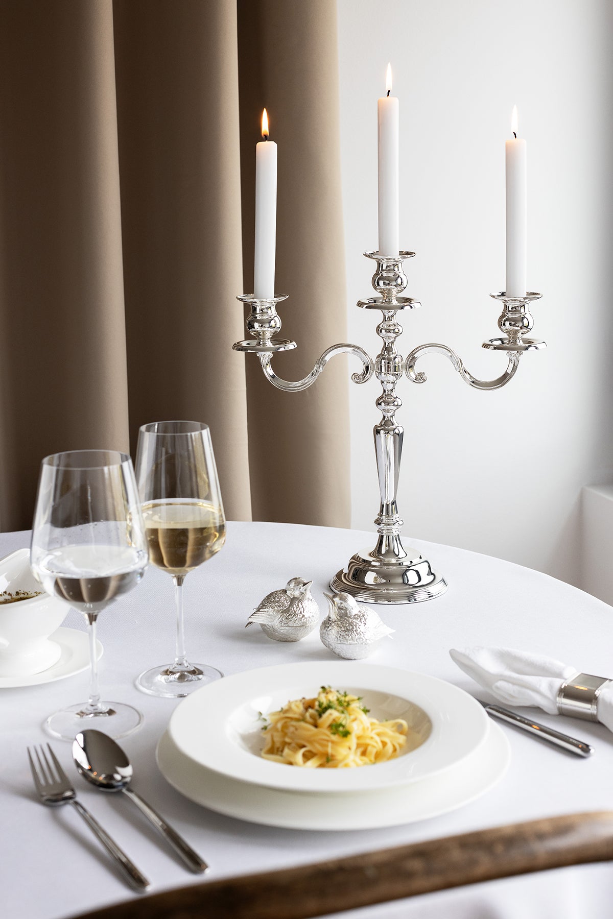 Edzard Candel Candlestick Regina (altura 36 cm), noble plateada para 3 velas de palo