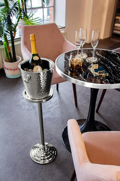 Celebre ocasiones felices con un champán de copa fresco y espumoso o vino espumoso, entonces el noble enfriador de champán es lo que es para ti. En él puede mantener convenientemente varias botellas de una noche deslumbrante completa constantemente fría. Aislamiento perfecto y diseño noble La producción especial del enfriador permite aislamiento óptimo de la temperatura ambiente incluso en días cálidos. La hermosa pieza hecha de metal precioso exuda un toque de lujo que da brillo adicional en cada ocasión solemne.