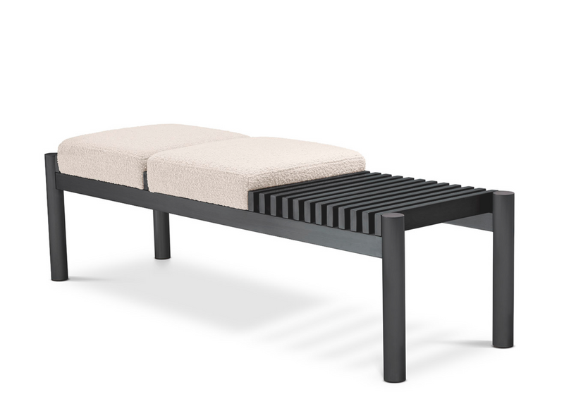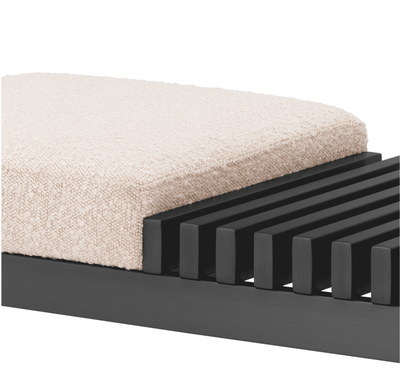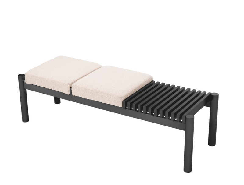 El bibi de banco con acabado de bronce es adecuado para su uso en el entorno privado, en oficinas, áreas de espera y bares. Sus líneas claras son ideales para enfatizar cada habitación, y se ajusta maravillosamente a cada habitación. Abra las listones a una distancia uniforme permiten que el aire y la luz se alivien y formen una contraparte perfecta en la cubierta de crema de bouclé de los dos asientos.