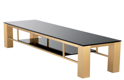 El Eichholtz El gabinete de TV Drexel le da a su sala de estar una presencia fresca y perfecta con sus líneas claras y su estilo moderno y abierto. Este aparador bajo ofrece espacio para un televisor de pantalla plana grande y tiene un estante abierto para almacenar dispositivos electrónicos, medios adicionales y más. Hecho de metal robusto, está provisto de un acabado de latón cepillado.