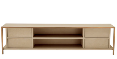 El Eichholtz El gabinete de TV Wilmot combina chapa de roble lavado y latón cepillado en un diseño simple y moderno que se ajusta a cada sala o habitación moderna. Dos armarios con cajones y dos estantes ofrecen suficiente espacio de almacenamiento para controles remotos, una biblioteca de medios y más.