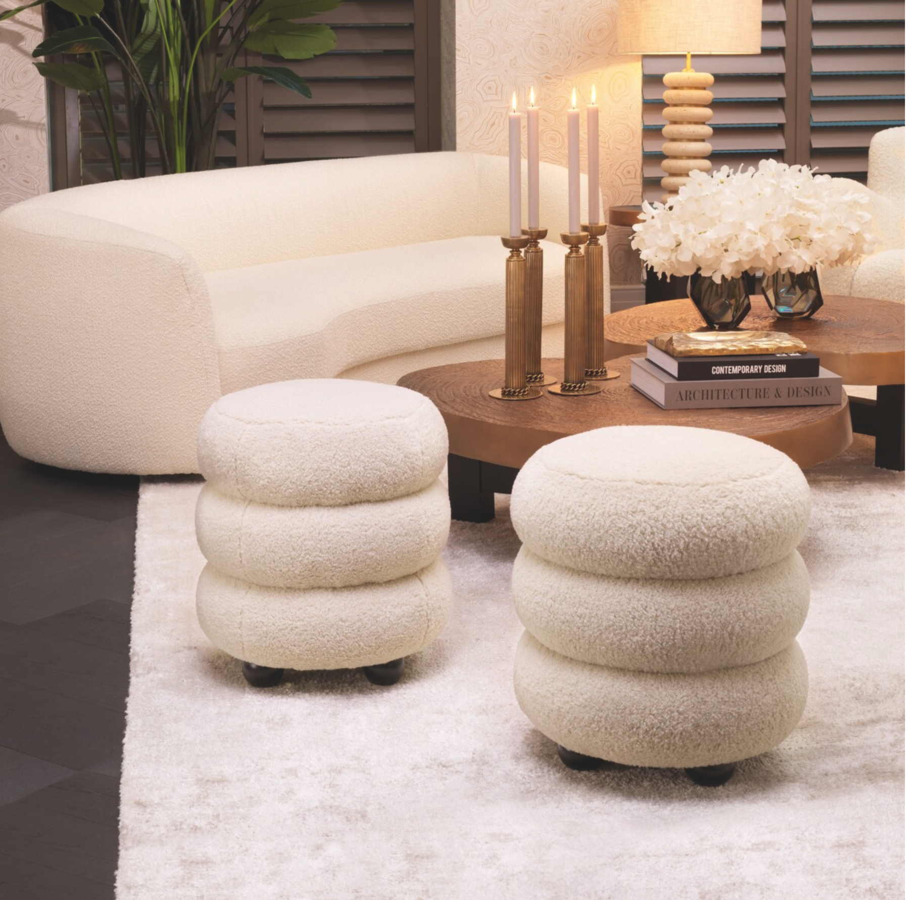 "El taburete de tulum exuda una sofisticación natural y lo invita a una atmósfera de elegancia refinada. Con su tapicería lujosamente fragante y un perfil bajo contemporáneo, le da a cada habitación una nota acogedora. Disponible en tres colores atractivos con pies negros".