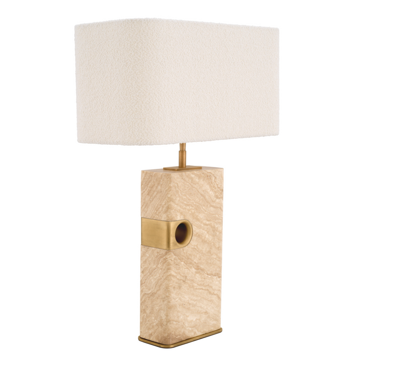 "La lámpara de mesa Sebago de Eichholtz Combina diseño y funcionalidad artística. Su pie hecho de noble travertino, combinado con acentos de latón y un paraguas de bouclé, complementa cada habitación con un toque de lujo ".