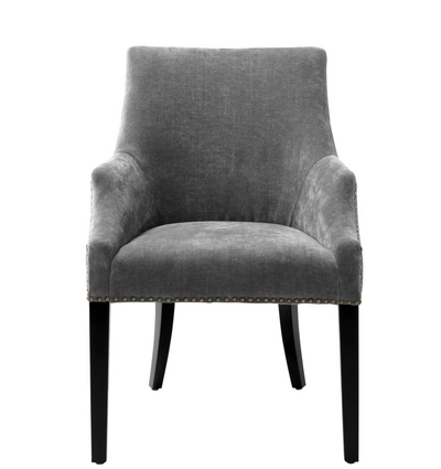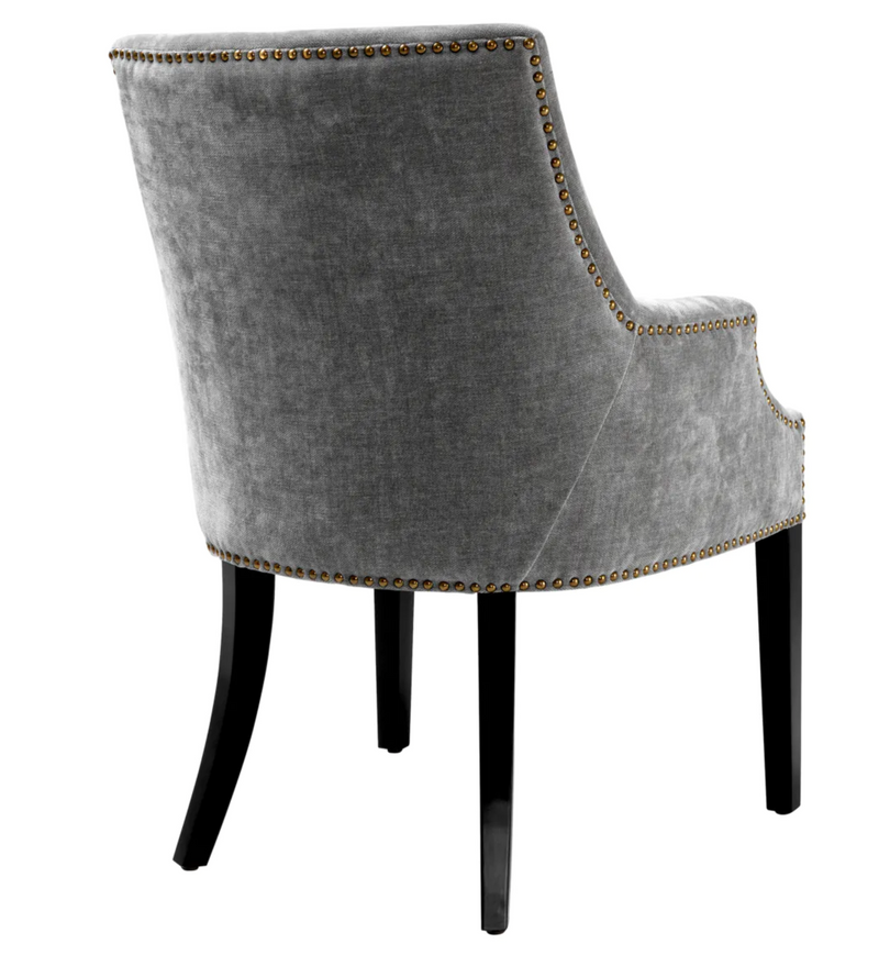 El Eichholtz El legado de la silla de comedor le da a los muebles de su comedor comodidad y estilo adicionales. Con su forma animada y su relleno de Clarck gris, ingeniosamente decorado con chistes de bronce pulido, esta silla exuda elegancia. Las delgadas patas de la silla negra completan el aspecto lujoso. Las dimensiones de 60x71x92 cm no solo ofrecen estilo, sino también conveniencia para su comedor.