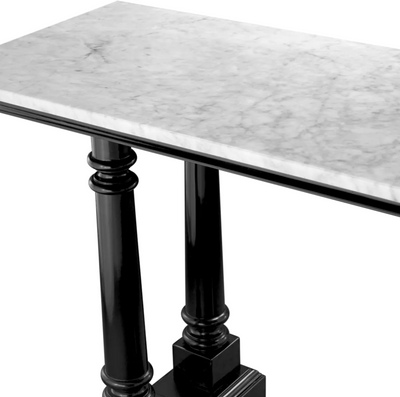- Diseño y estilo: Mesa de consola elegante con un marco de adorno pintado negro y una mesa noble hecha de mármol blanco, decorado con florituras y grano.