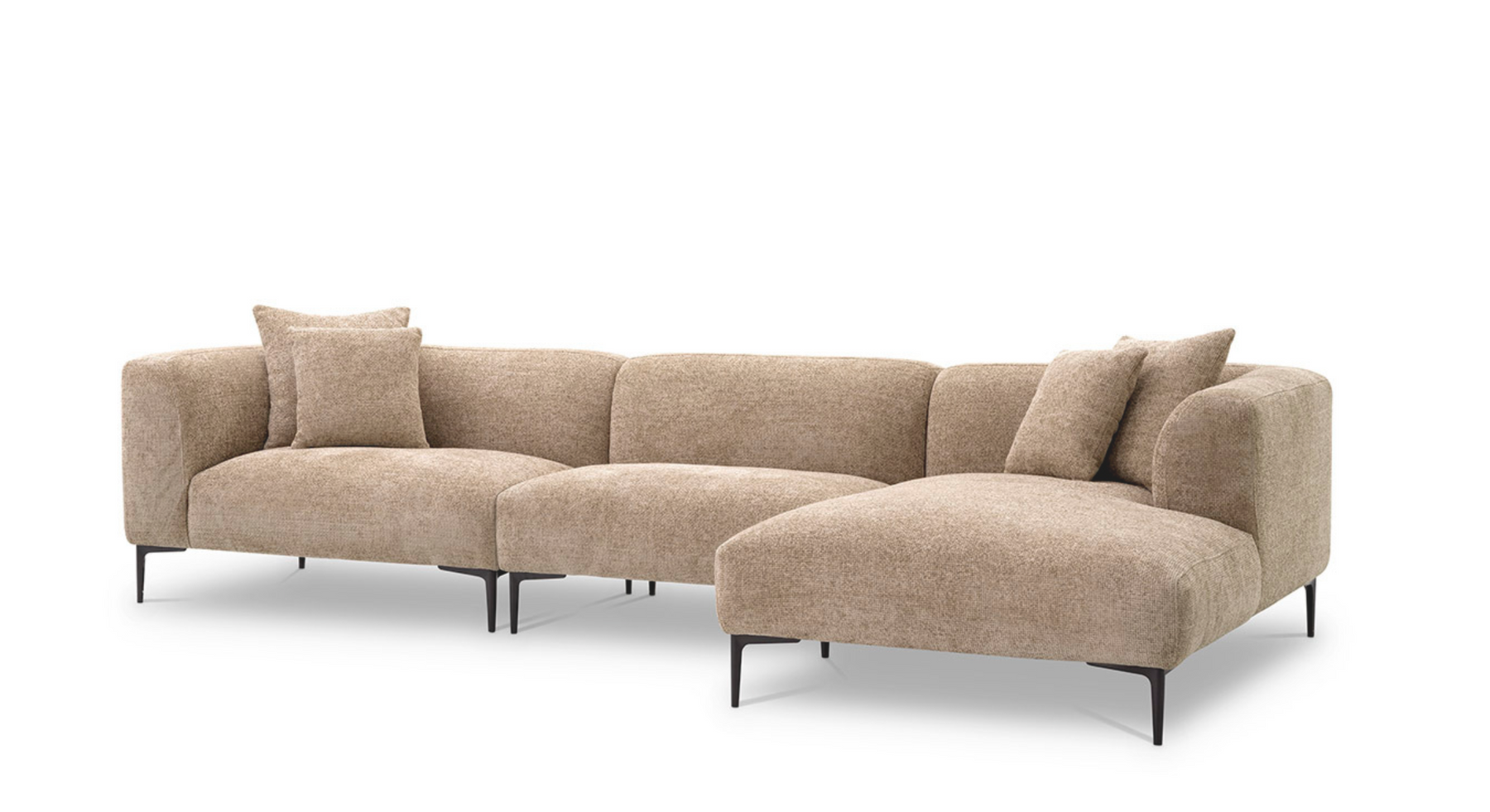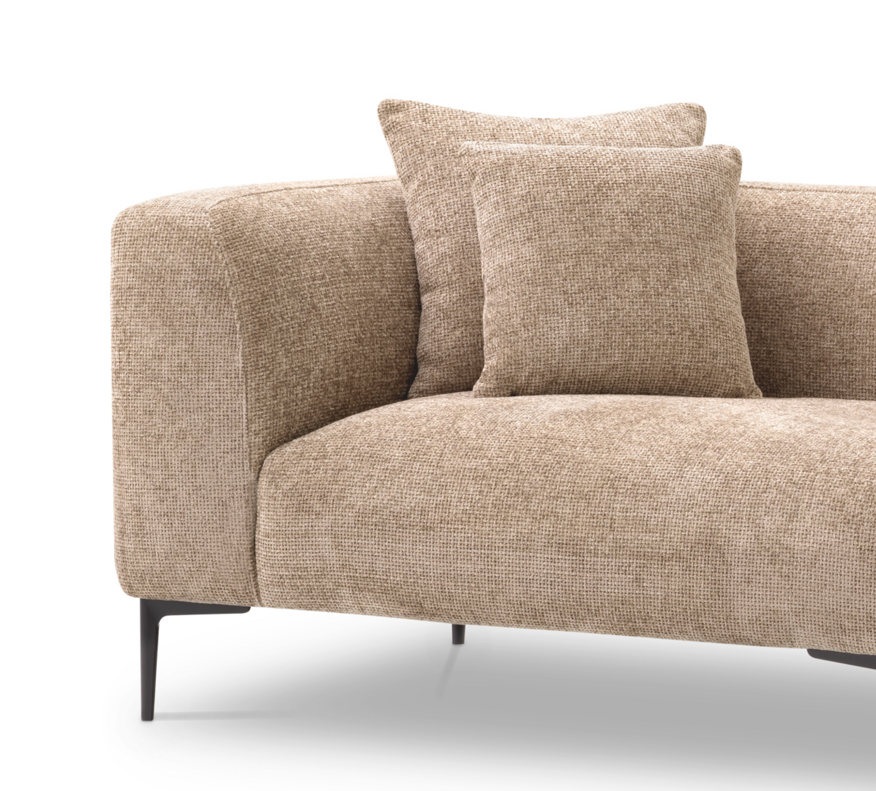 - Diseño y estilo: silueta asimétrica, reposabrazos elegantes, relleno textil, diseño único de piernas negras