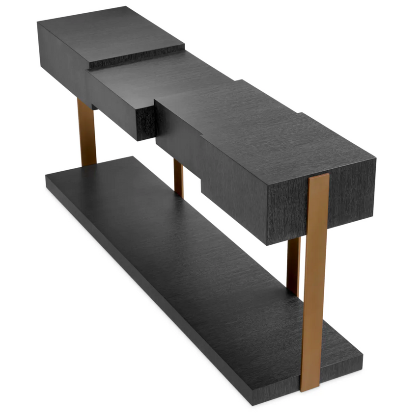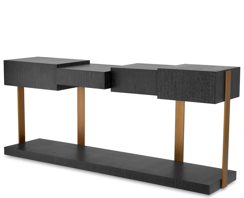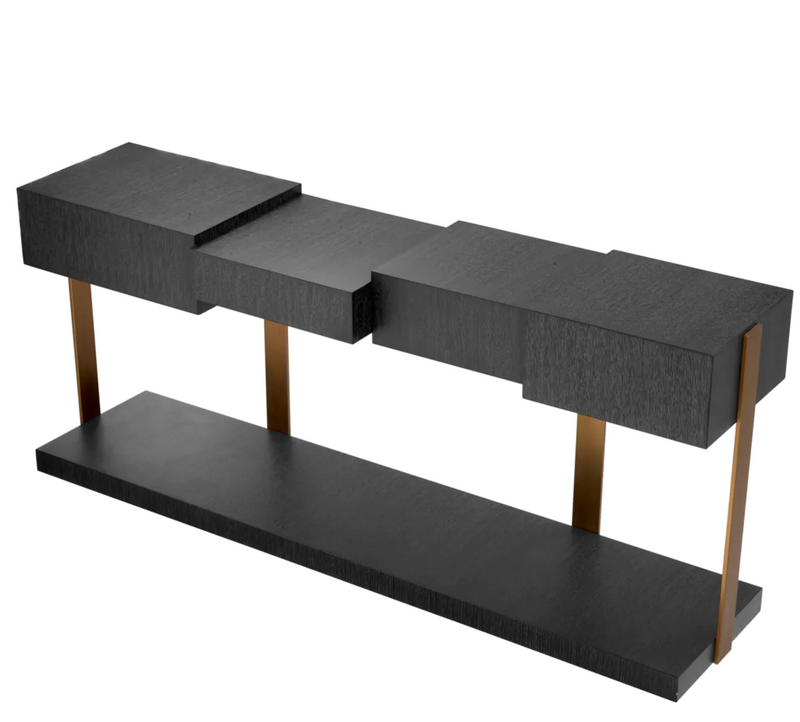 El Eichholtz La mesa de la consola Nerone le da a cada sala o sala de estar un toque moderno. Con las dimensiones 180x42.5x76.5 cm y una combinación refinada de chapa de roble negro y una base de acabado de bronce, esta tabla ofrece estilo y funcionalidad. Su diseño superior dividido único y trimestral lo convierte en un llamativo moderno.