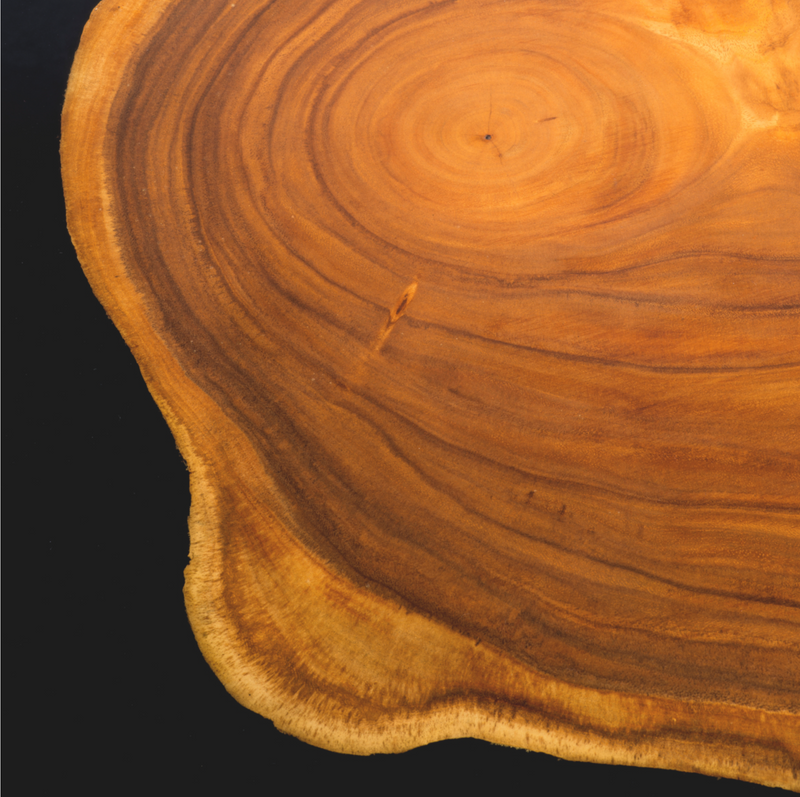 - Diseño y estilo: estilo orgánico y elegante con una mesa hecha de tronco de árbol y base de latón cepillado