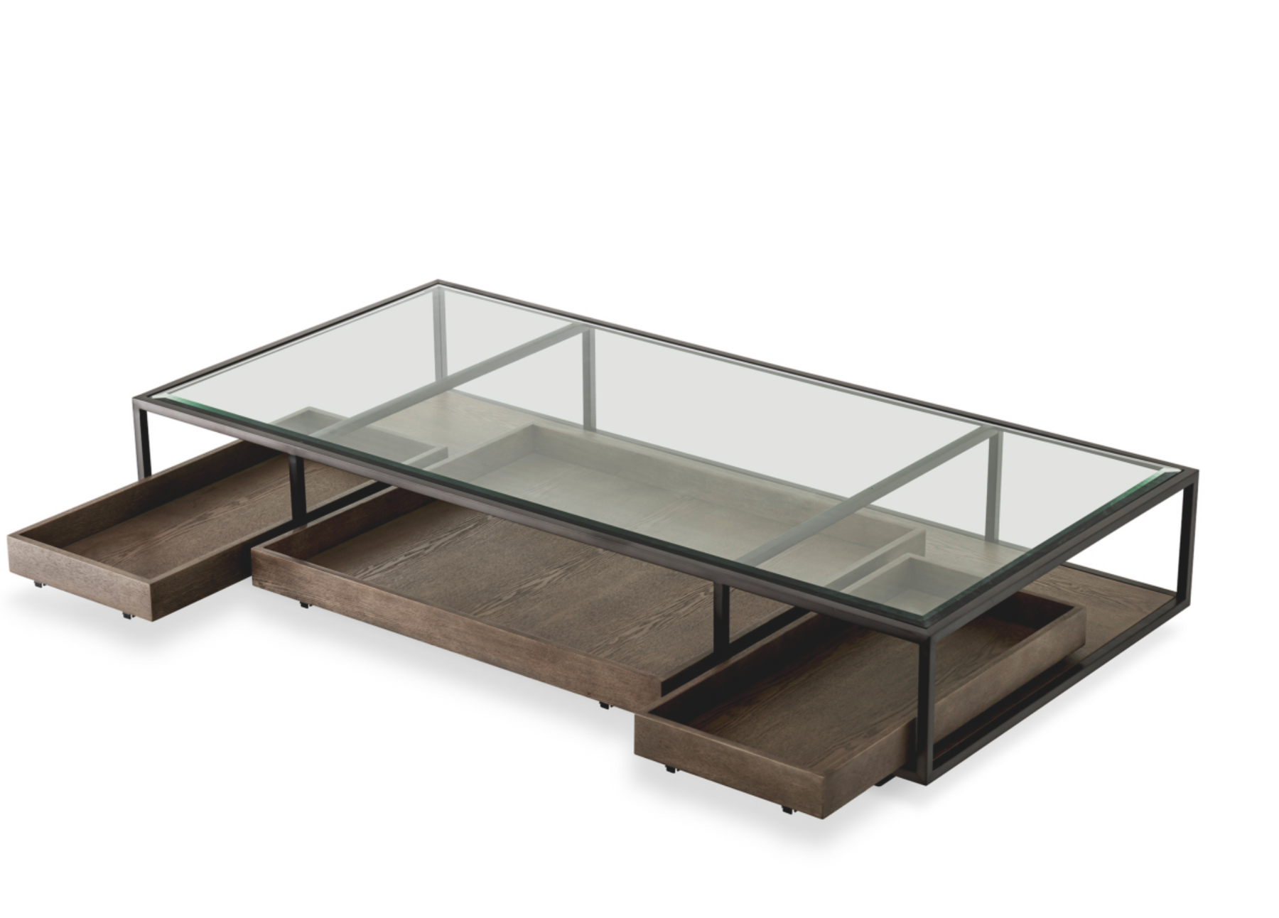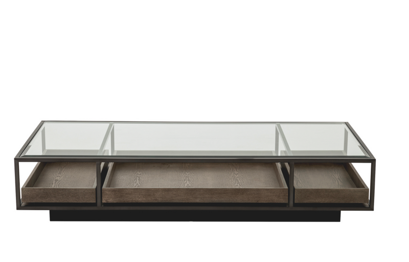 El Table de Salon Roxton es una superficie sorprendente para la exposición de su decoración. La parte inferior de su marco con color bronce está provisto de tres cajones grises de chapa en rieles, de modo que sus revistas y controles remotos siempre sean claramente visibles debajo de la placa de vidrio e inmediatamente a la mano.