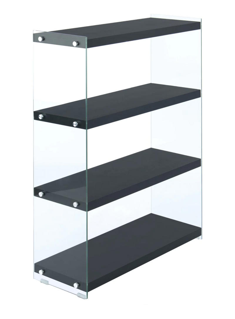 La elegancia cumple con la funcionalidad con el estante negro Malkolm. La combinación de MDF de alto brillo y pisos de vidrio transparente crea un carisma moderno y al mismo tiempo ofrece mucho espacio de almacenamiento y área de presentación para su hogar.