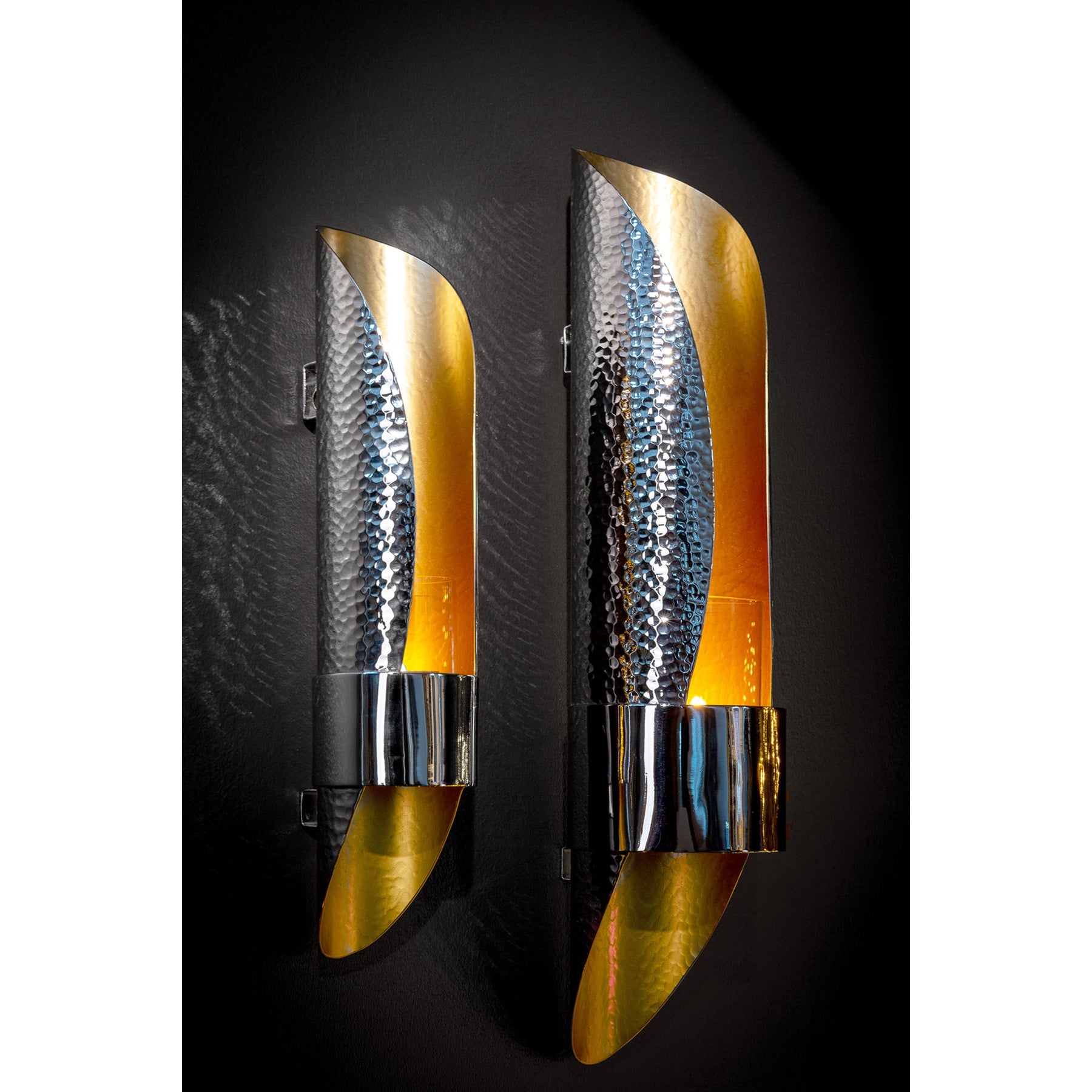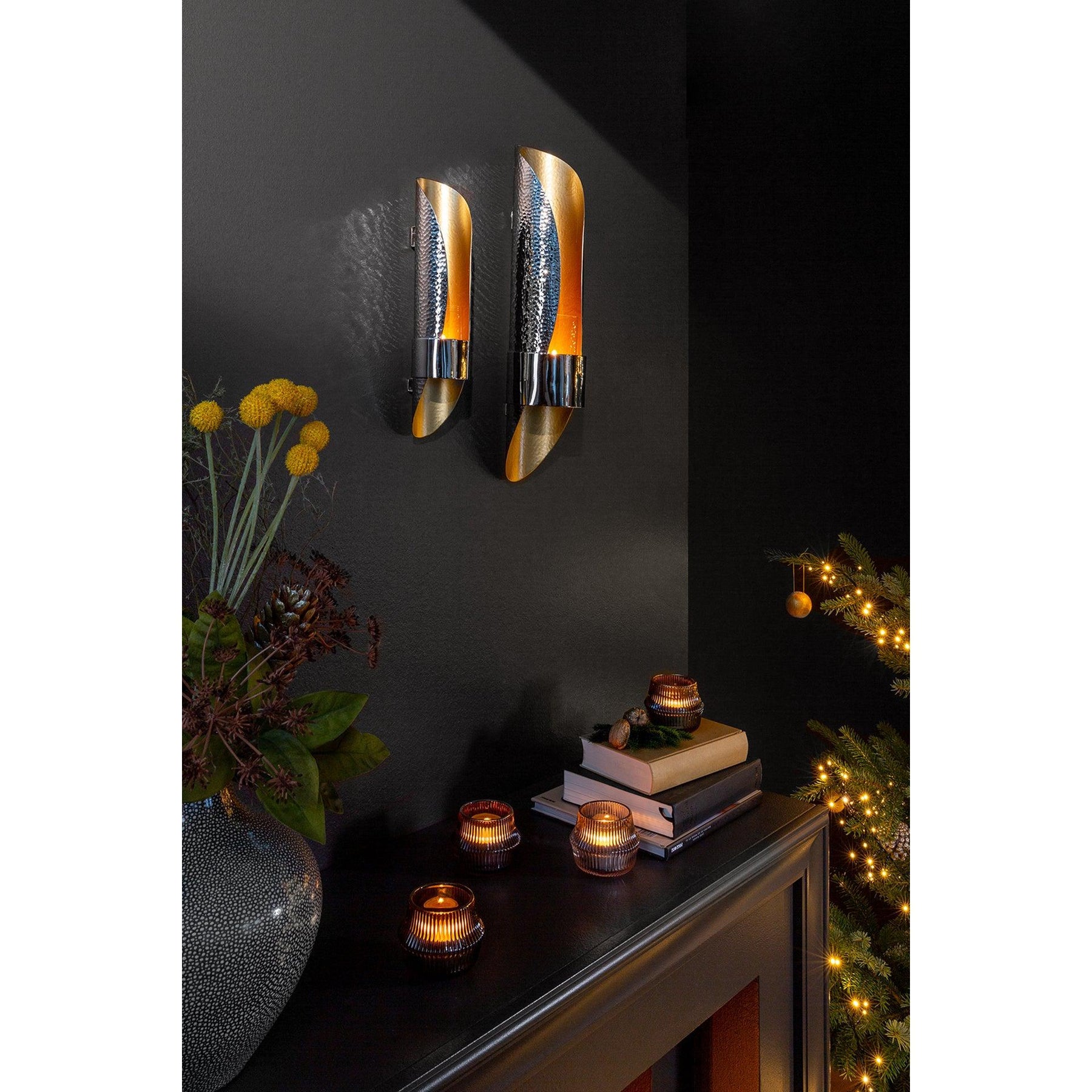 A menudo son los contrastes los que dan vida a las cosas: la interacción del brillo plateado fresco y el tono de oro cálido hacen que el portavelas de la pared sea una verdadera joyería. La óptica de trazo de martillo fabricado artísticamente también brinda a estos accesorios para el hogar una artesanía especial que hace que cada pieza sea única. Los candelabros de la pared entran en sí mismos particularmente bien en el arreglo simétrico al lado de las puertas y las imágenes, la pintura de oro en el interior aumenta la cálida luz de las velas. Dos tamaños están disponibles para usted. Se crean pequeñas irregularidades en forma, superficie u otros detalles durante la producción tradicional y le dan a cada artículo un encanto individual. Cada copia es única.
