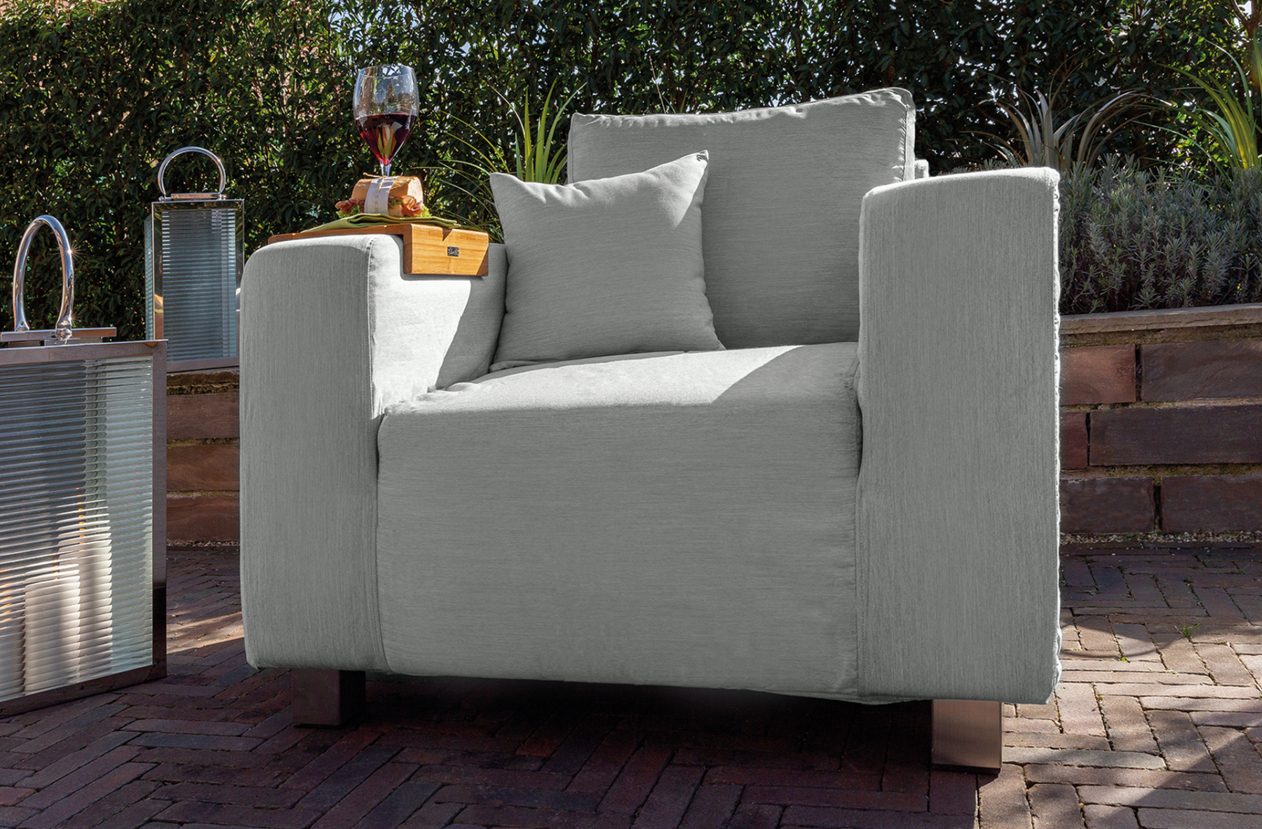 "Transforme su asiento individual con la conexión de la colección Carlo en un punto más destacado. La fibra sintética, el fungicida y los UV resistentes, promete durabilidad y comodidad. Perfecto para adentro y al aire libre.