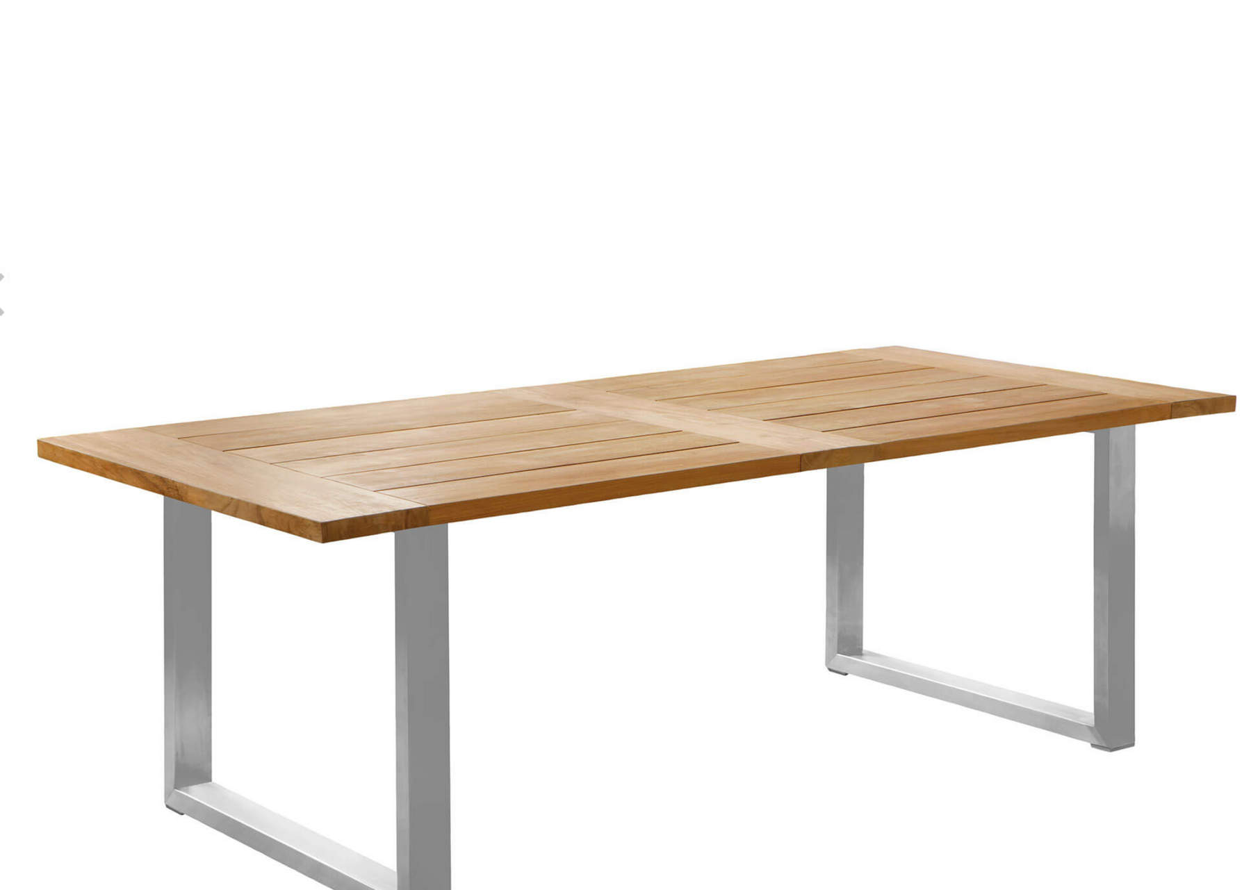 Descubra la mesa de comedor "Paolo", una simbiosis armoniosa hecha de teca estable y elegante acero inoxidable. Perfecto para usar al aire libre o como un corazón de su comedor, con dimensiones de 220x100x75 cm.