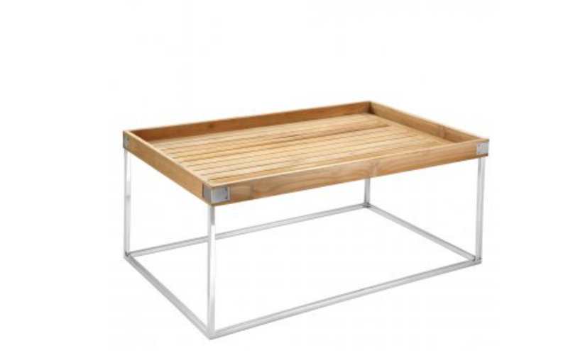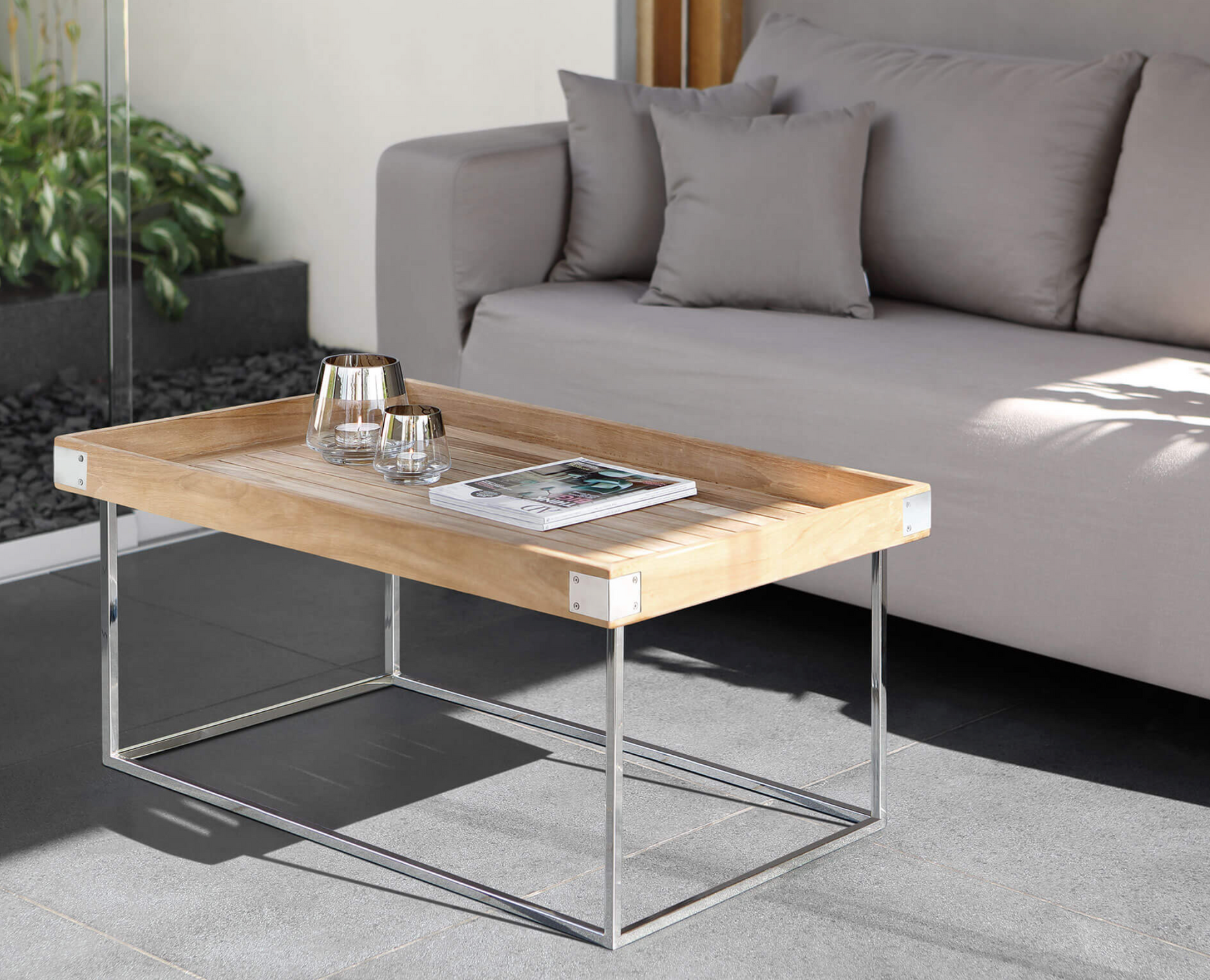 La elegante mesa lateral "Diego" combina la funcionalidad con elegancia. Su marco hecho de acero inoxidable robusto y la placa de teca son perfectas para cada ambiente. Se integra perfectamente en diseños modernos y clásicos.