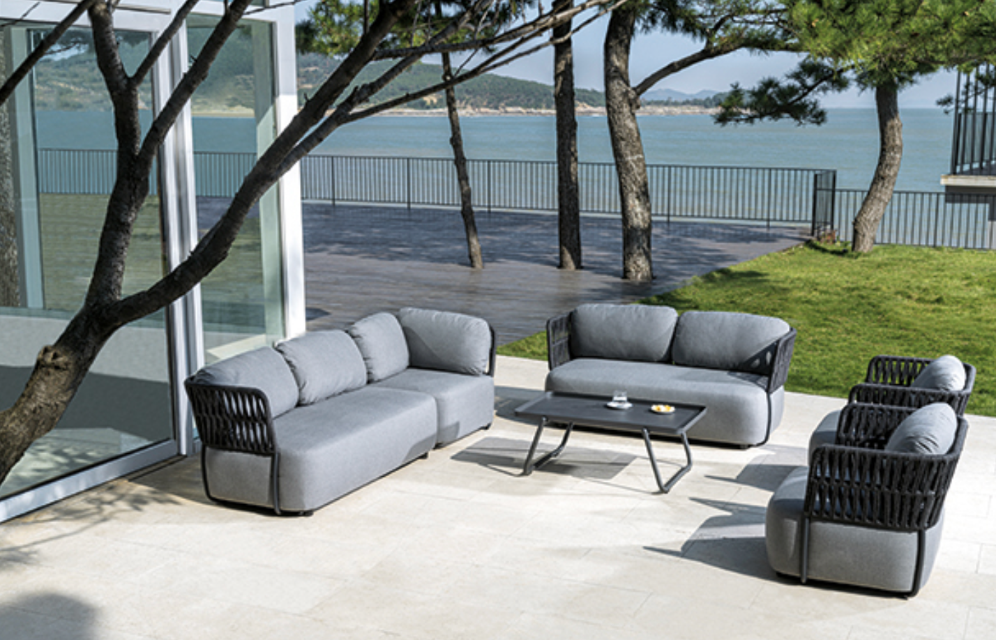 Este conjunto parece estar diseñado para el área al aire libre, con materiales que están orientados a la longevidad y la resistencia a las influencias climáticas. El diseño modular permite diversos arreglos, dependiendo del espacio y las necesidades.