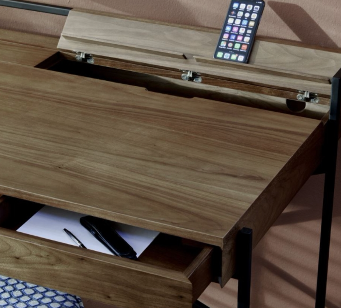 La mesa de escritorio está hecha de madera de macizo parcial, lo que garantiza una estructura robusta y duradera. El uso de la chapa MDF le da a la superficie un aspecto atractivo de nogal que trae calidez y elegancia a la habitación. Esta superficie no solo es atractiva, sino también fácil de mantener.