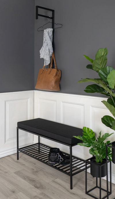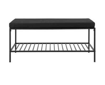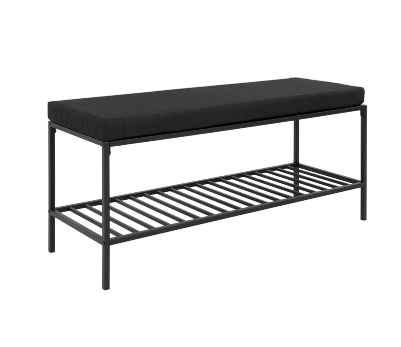 - Diseño y estilo: Banco con almohadas y estante, piernas de metal negro