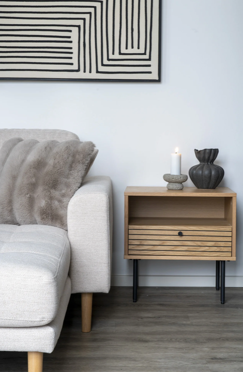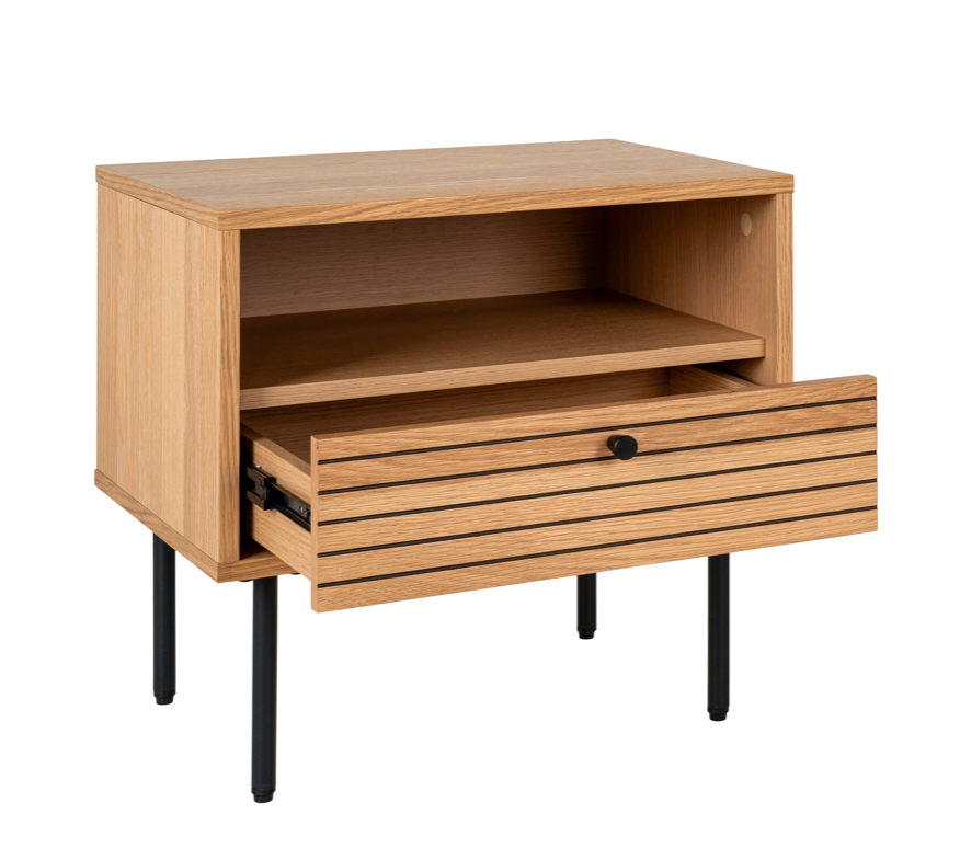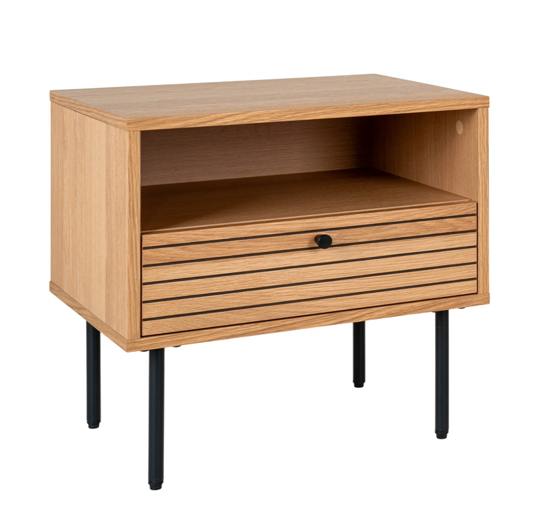 - Diseño y estilo: Mesa auxiliar con un cajón, chapa de roble y patas de metal negro