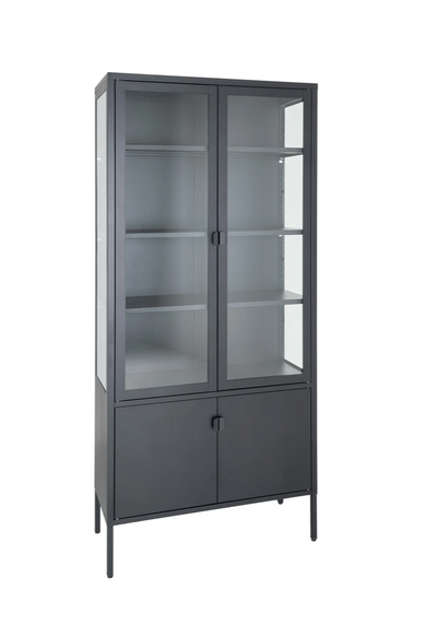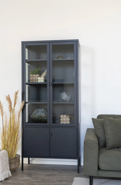 La colección Matera Vitrine Azura es la solución perfecta para mostrar y proteger con estilo sus valiosos objetos. Con cuatro puertas negras y un marco de acero robusto, este escaparate le da a su habitación un toque de elegancia. Las piernas de black metal no solo ofrecen estabilidad, sino también un diseño moderno.