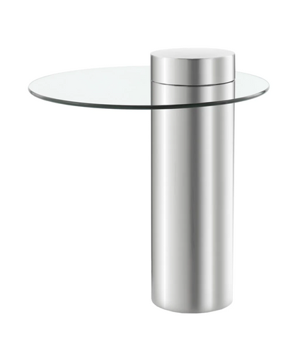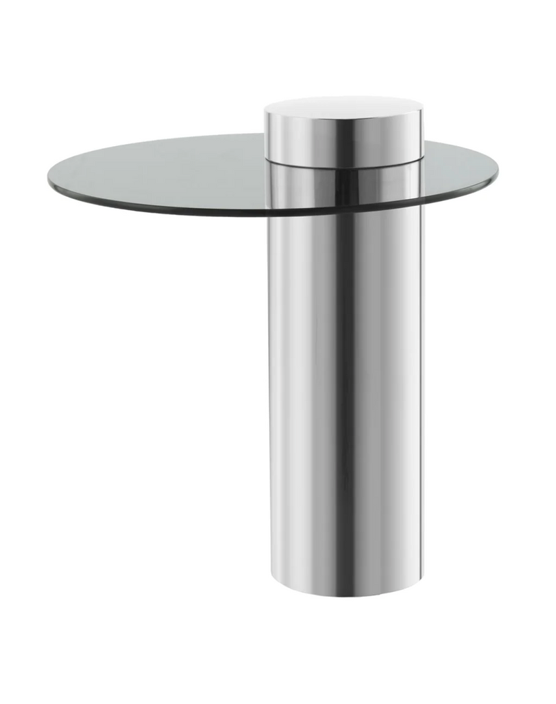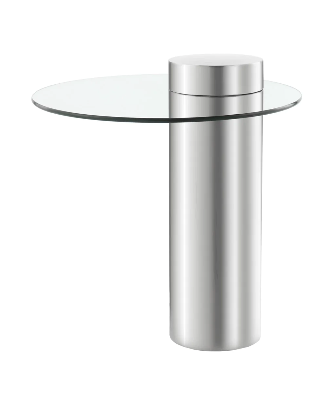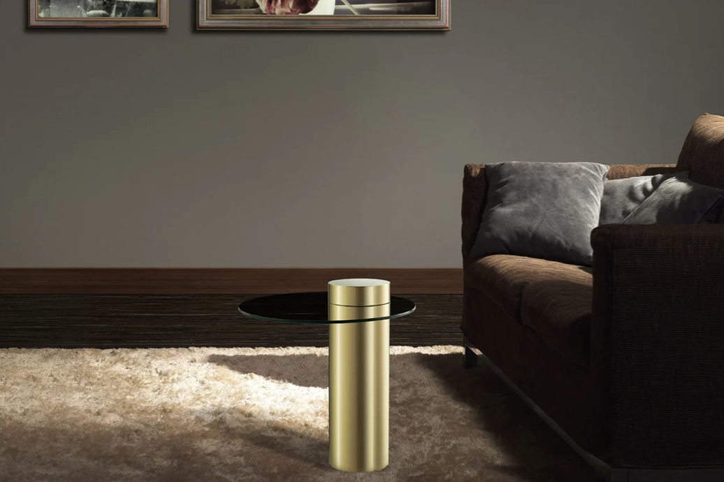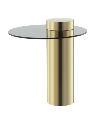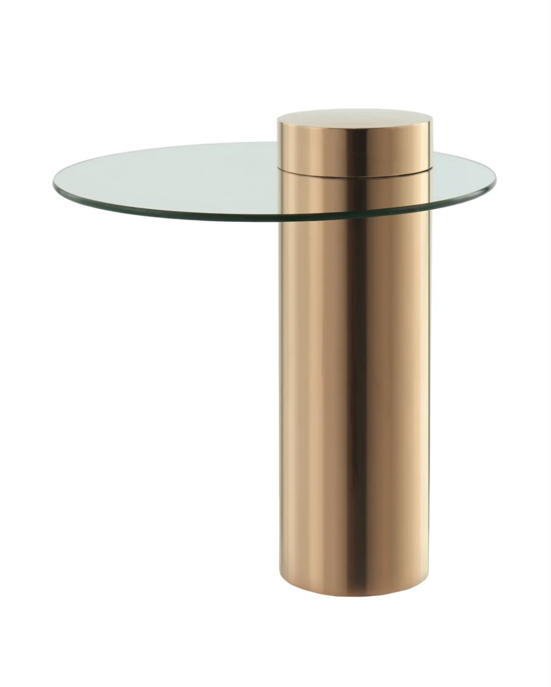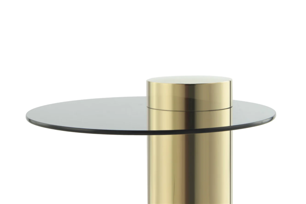 "Descubra la mesa lateral de Anea de Material - Una combinación armoniosa de oro y gris, hecha de acero inoxidable y vidrio de seguridad. Un lujoso enriquecimiento para cada hogar ".
