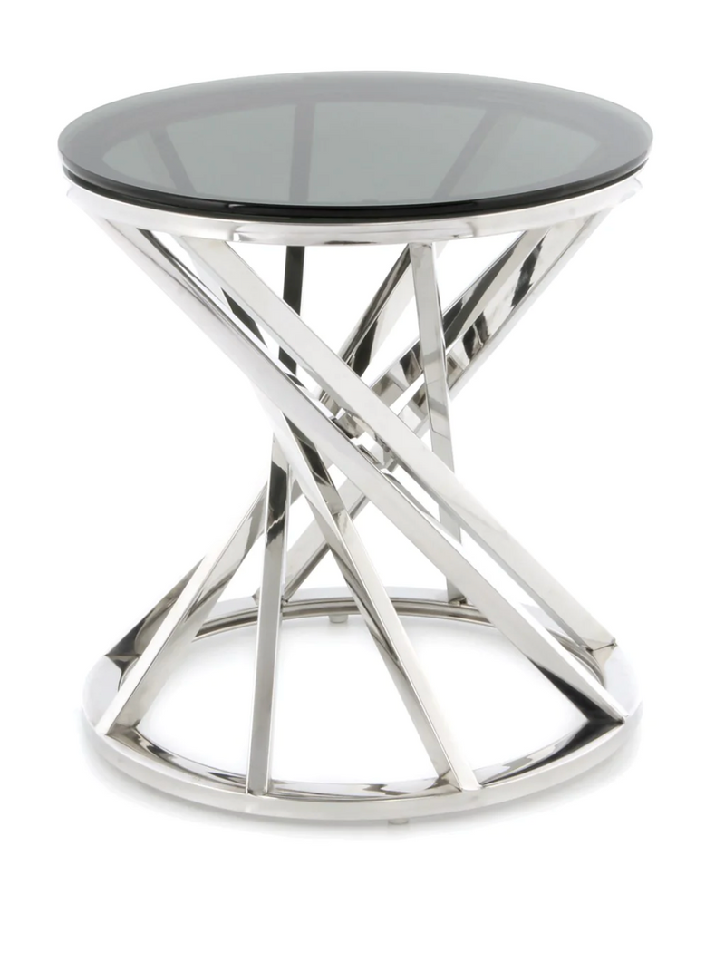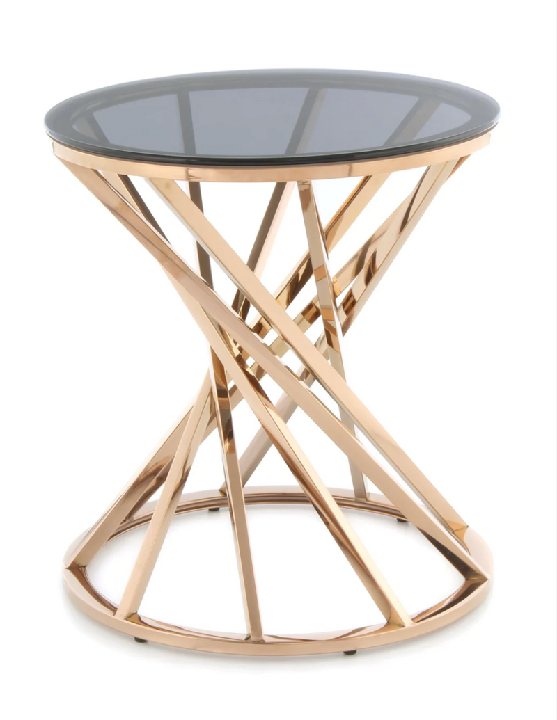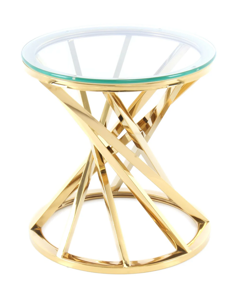 "El Material La mesa lateral Eldor combina elegancia con funcionalidad. La noble combinación de vidrio de seguridad transparente y acero inoxidable calado con oro se adapta a la perfección en cada interior moderno ".