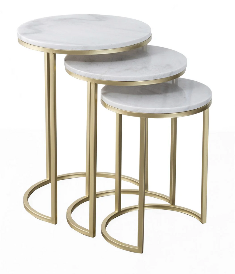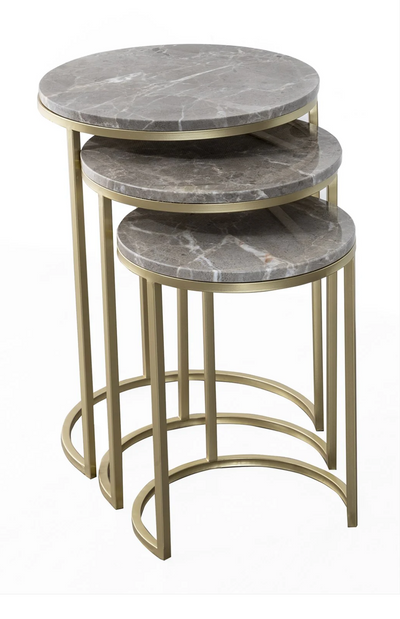 "Descubra el elegante conjunto de mesa auxiliar Moyoom Dilja, que convence con su diseño moderno de hierro robusto y la losa de mármol noble en gris. Ideal para un ambiente vital contemporáneo".