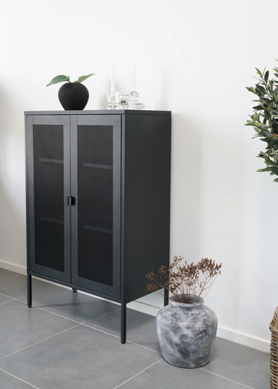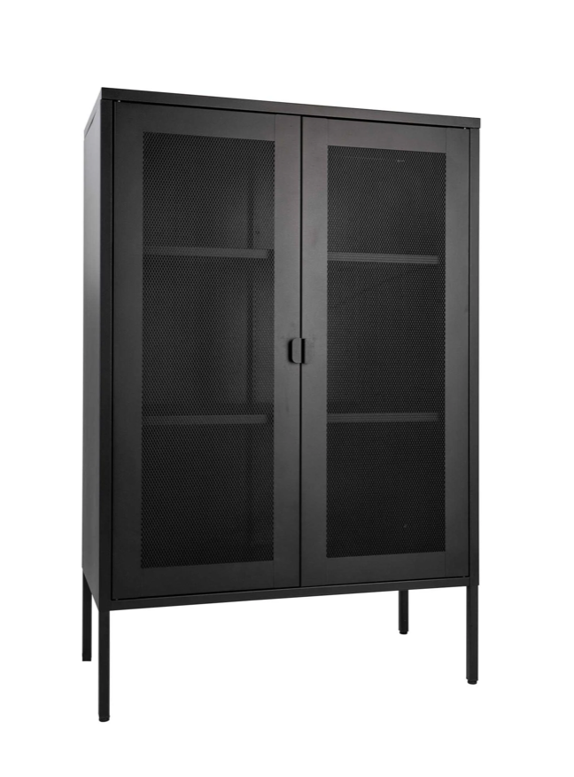 El Matera Vitrine Runa es la solución ideal para mantener sus objetos elegantes y exhibir. Con su robusto marco de acero negro y las dos puertas de malla, este escaparate da un toque moderno para cada habitación.