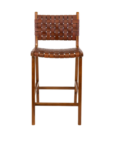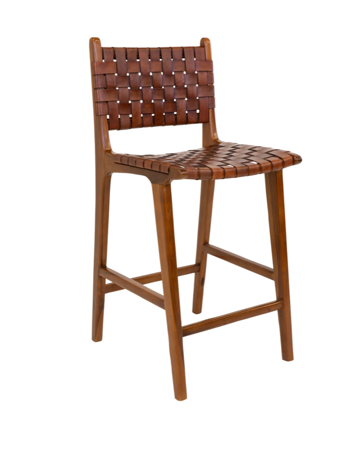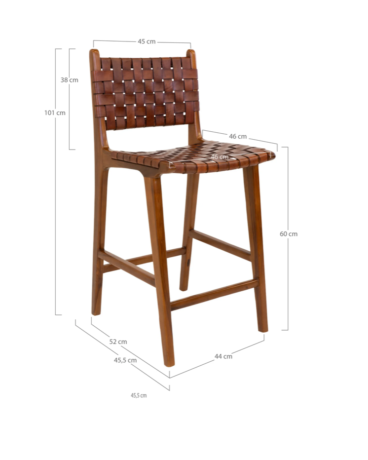 - Diseño y estilo: Silla de mostrador hecha de teca con asiento de cuero marrón