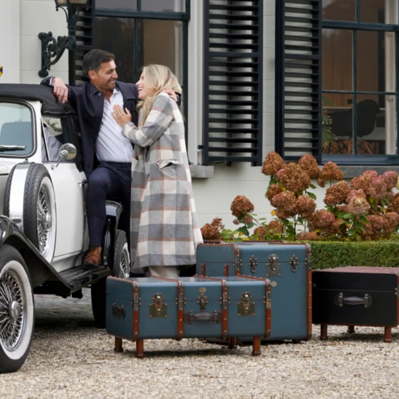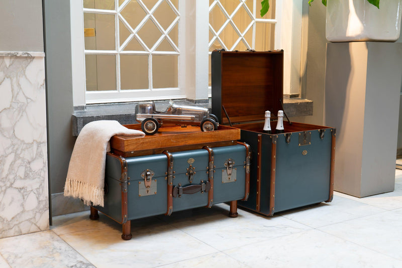 El equipaje victoriano estaba hecho para ser enviado en tren, barco de vapor y coche de caballos. Los baúles se enviaban por delante y eran manipulados exclusivamente por porteadores. Los clásicos aros de arce, reforzados con herrajes de latón y esquinas reforzadas, protegían el baúl y su contenido de posibles daños. La forma alta y cuadrada de nuestro baúl de "mesa auxiliar" se diseñó para que cupiera fácilmente en camarotes estrechos en viajes largos. Sin embargo, era lo bastante grande como para acomodar un sombrero alto de copa negra. Disfruta del sabor de una época pasada de lujo. Combina el encanto del fin de siglo con la practicidad de un almacenamiento eficaz.