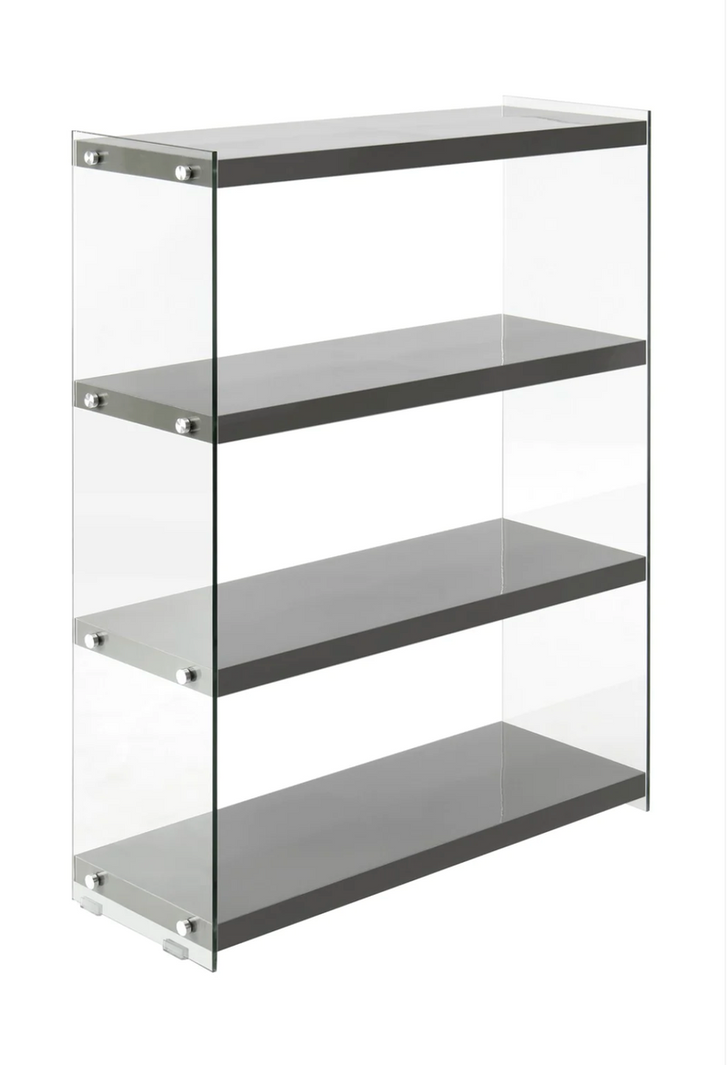 Crear orden y estilo con eso Regal Maya. El MDF gris de alto brillo y los pisos de vidrio transparente le dan a su habitación un toque moderno y aireado. Ideal para libros, decoración o como un elegante divisor de habitaciones.