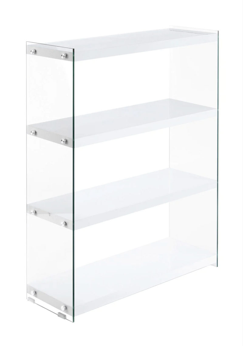Crear orden y estilo con eso Regal maya blanca. El MDF gris de alto brillo y los pisos de vidrio transparente le dan a su habitación un toque moderno y aireado. Ideal para libros, decoración o como un elegante divisor de habitaciones.