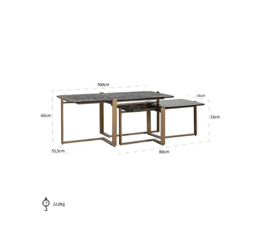 El Richmond Interiors Table de Salon El conjunto de 2 de "Sterling" es un impresionante mueble que le da a su sala de estar un toque de lujo y elegancia. Este conjunto consta de dos mesas de café que se complementan perfectamente. Todos Table de Salon Tiene una altura de 40 cm, un ancho de 110 cm y una profundidad de 65 cm.