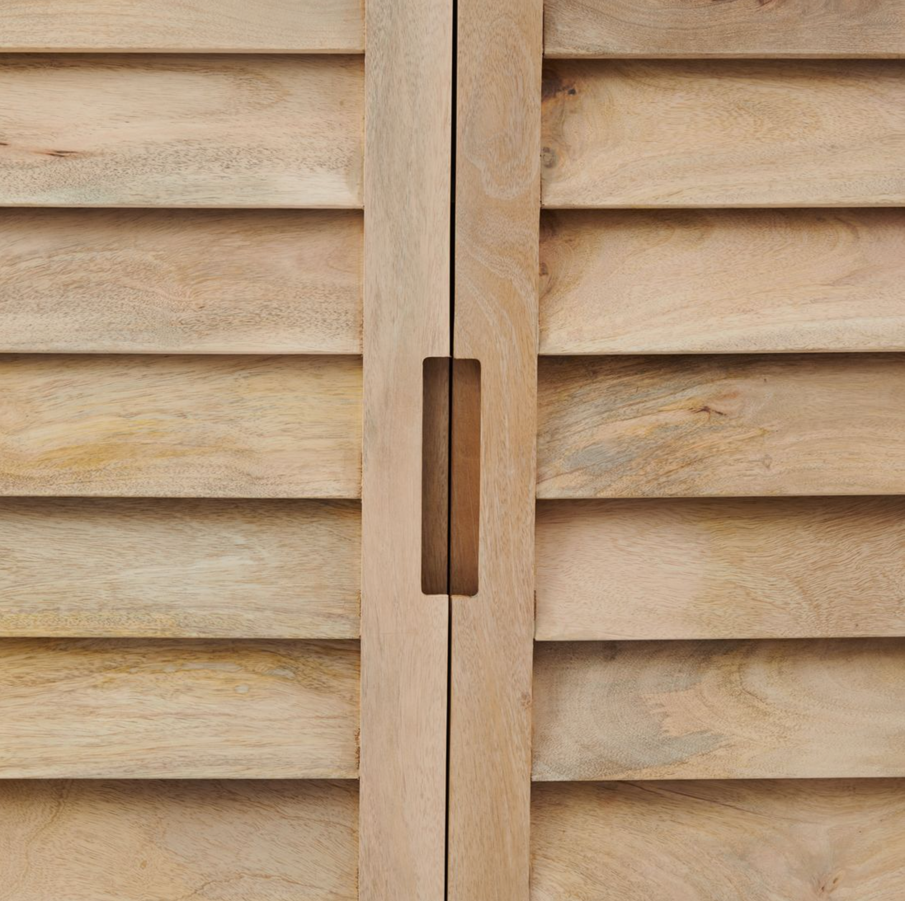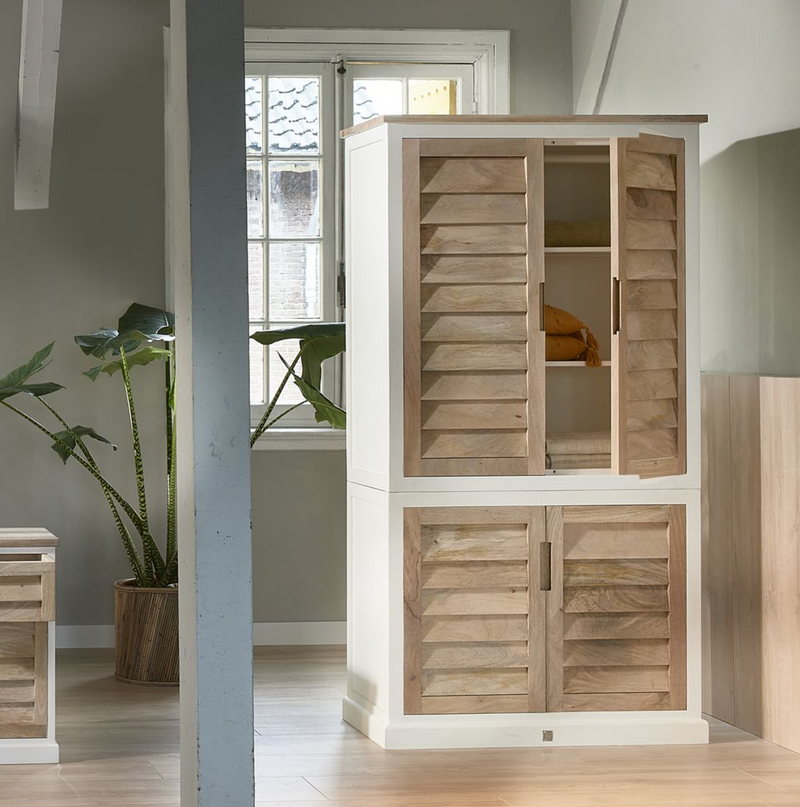 Este es el guardarropa de la serie Pacifica de Riviera Maison , Una serie de muebles sorprendentemente hermosos hechos de madera pintada blanca y madera de mango de color natural. Lo bueno de este gabinete es que, además de la posibilidad de guardar ropa, también tiene una espaciosa área colgante. Con este armario, también, las puertas se cierran con una técnica suave y suave. Varios muebles están disponibles en esta serie.