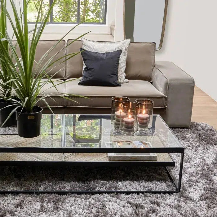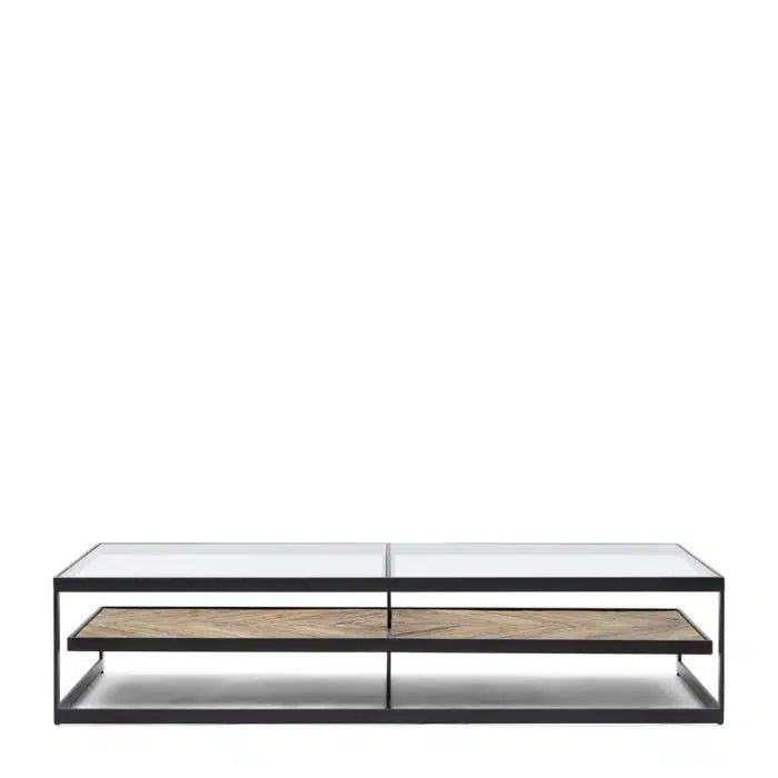 El Graydon Table de Salon Rivièra Maison es una obra maestra de diseños de muebles modernos. Con su combinación de chapa de roble oscuro, vidrio endurecido y un marco de hierro asimétrico, le da a cada sala de estar un toque elegante. La placa de vidrio aparentemente flotante no solo ofrece un área de presentación elegante para decoraciones, sino también un estante práctico.