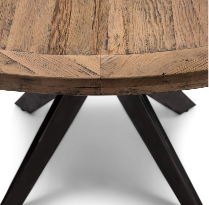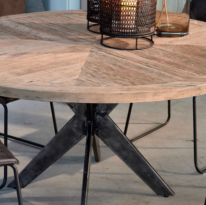 La mesa de comedor de Falcon Crest de Riviera Maison es una hermosa mesa de comedor redonda con un diámetro de 1,5 metros. La tabla está hecha de roble procesado insertado. Esta vieja madera de roble tiene una gran variación de estructuras y colores. ¡Ninguna mesa es la misma! El marco de la mesa de alucir de madera está hecho de hierro y se mantiene en negro mate. Esta sólida mesa de comedor también está disponible en una versión rectangular.