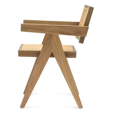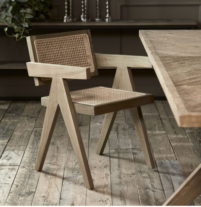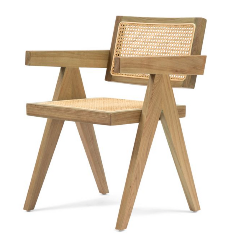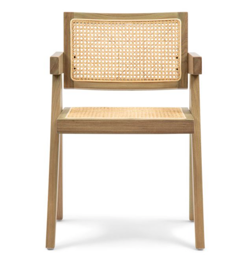 El comedor de comedor de comedor de St. Moritz con reposabrazos tiene un diseño simple. Esta silla es moderna y atemporal al mismo tiempo. El marco está bellamente formado de madera de olmo y se usó una auténtica malla de ratán tanto para el asiento como para el respaldo. Con un tamaño cómodo de 53x60x79 cm, esta silla se adapta bien a cada mobiliario.
