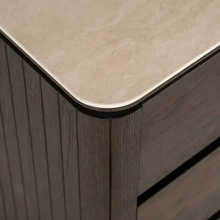 Travertin -keramiikka, tammiviilu, MDF, kierrätetty puu, metalli